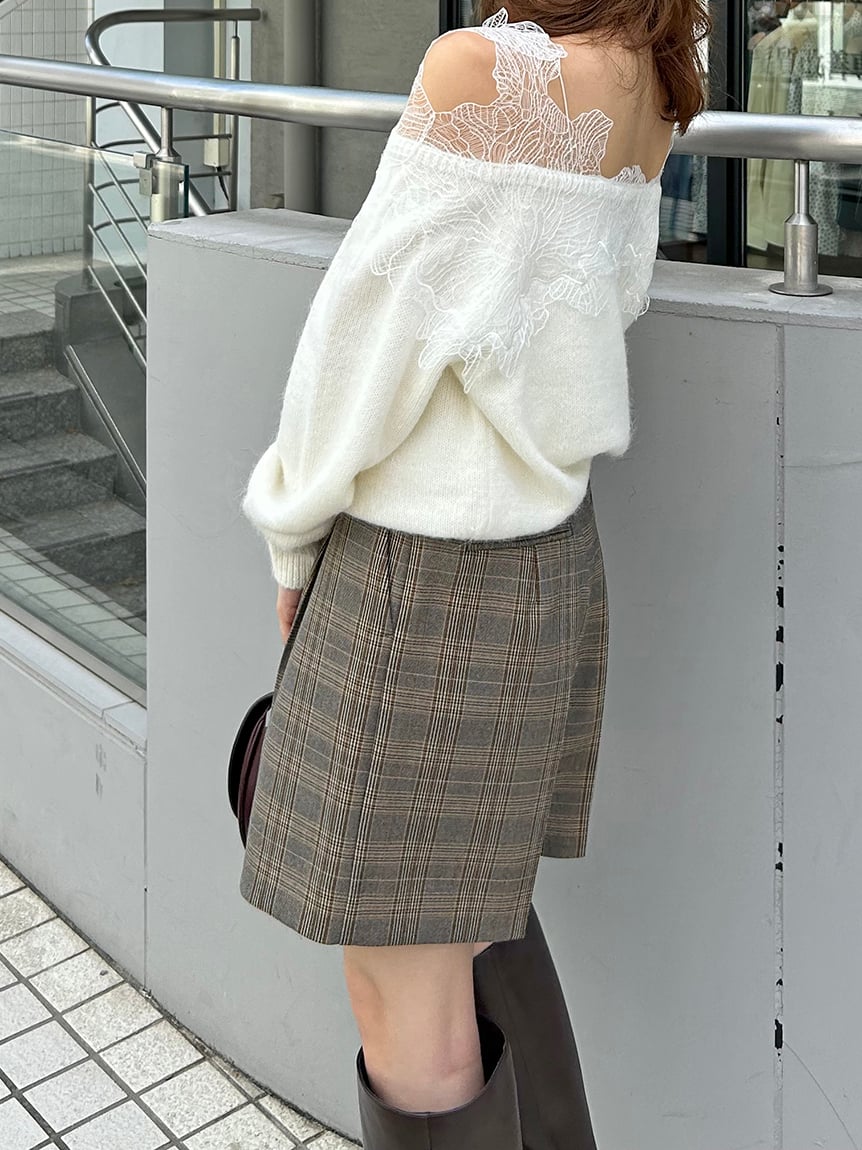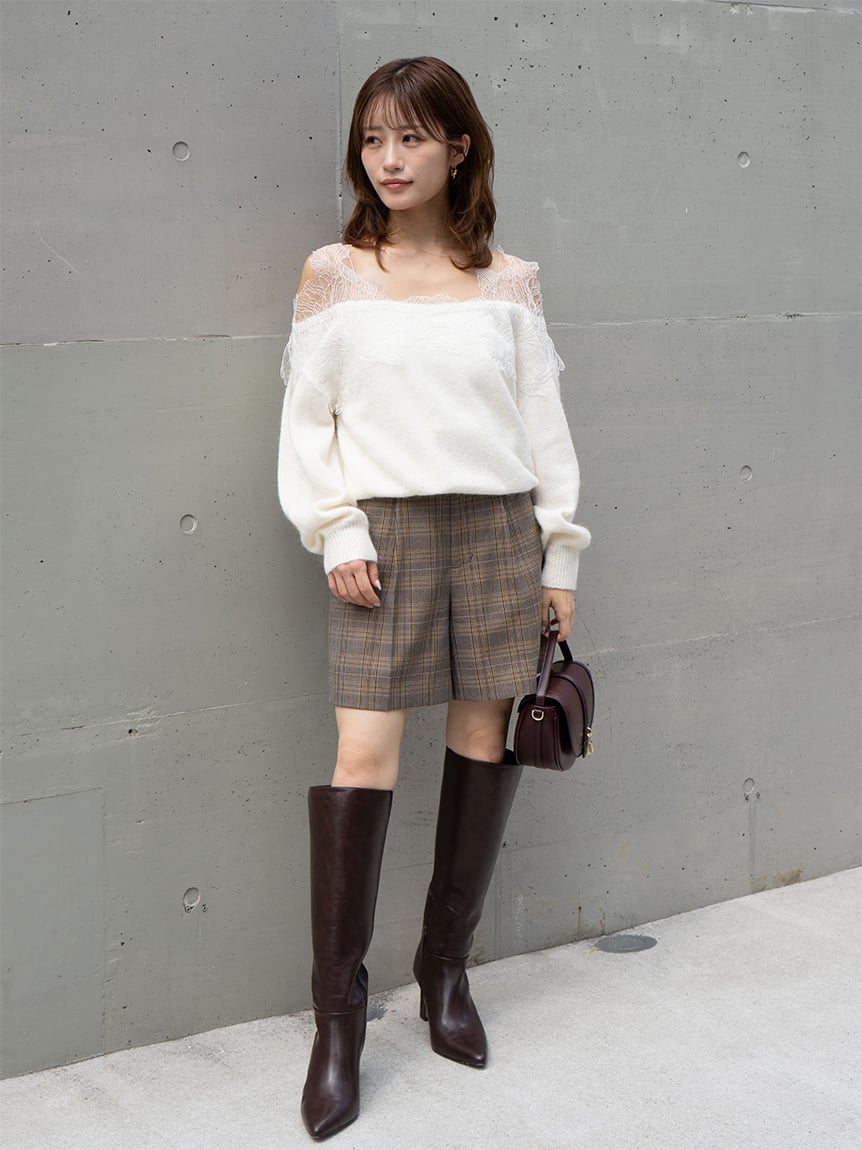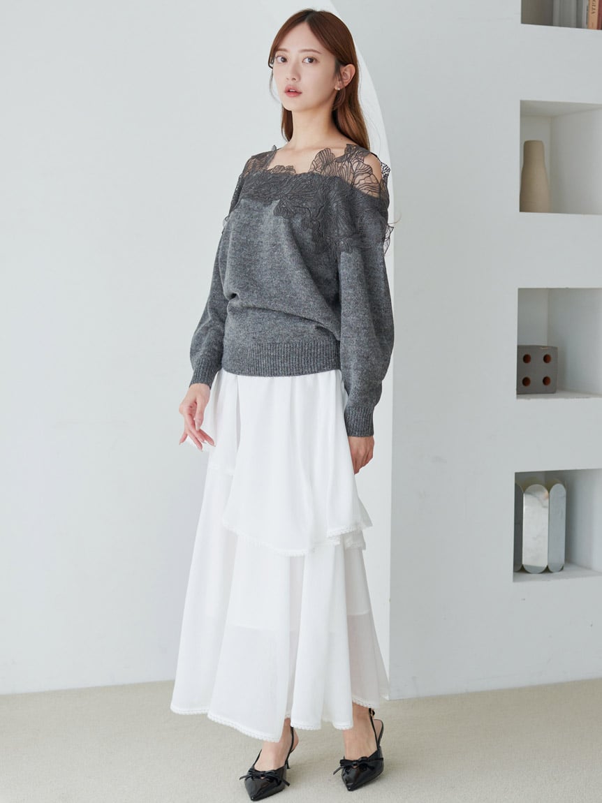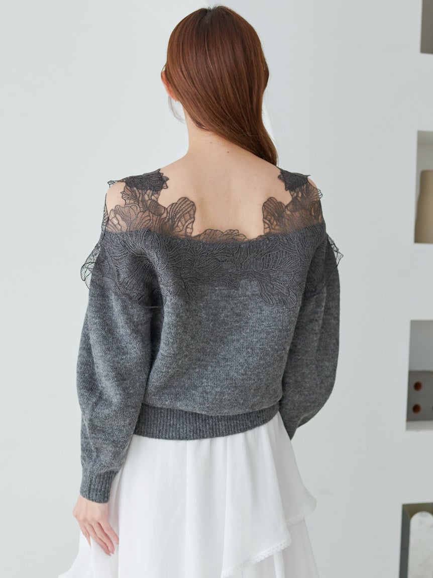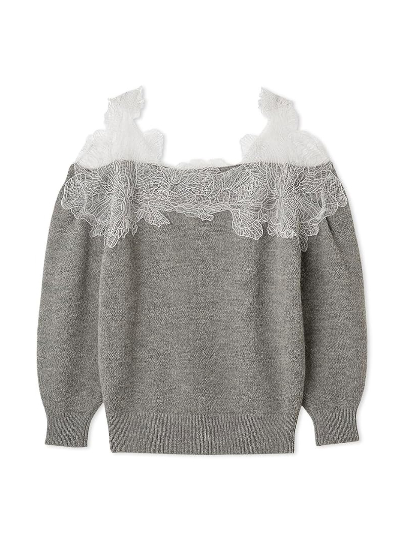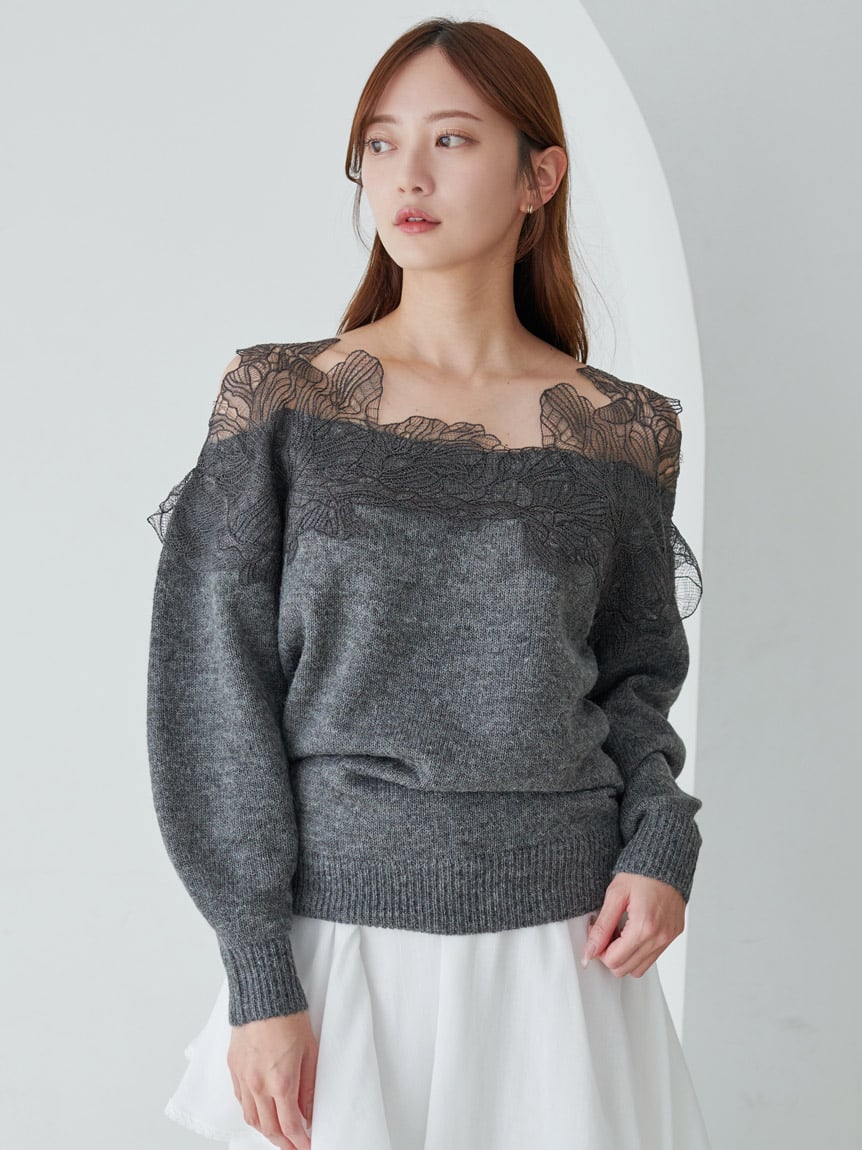 帶有光澤與透膚感的蕾絲,凸顯女性柔美氣息。針織部分採用混紡羊駝毛與羊毛的柔軟保暖素材。寬鬆輪廓營造自然隨性的穿搭感。