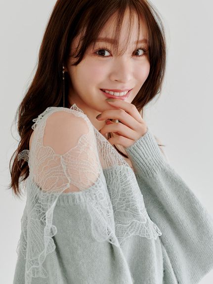 結合細緻華麗的薄紗蕾絲與柔軟針織布料的滾邊針織上衣。從鎖骨至肩線處大面積點綴的葉紋蕾絲,展現細膩優雅的表情。
