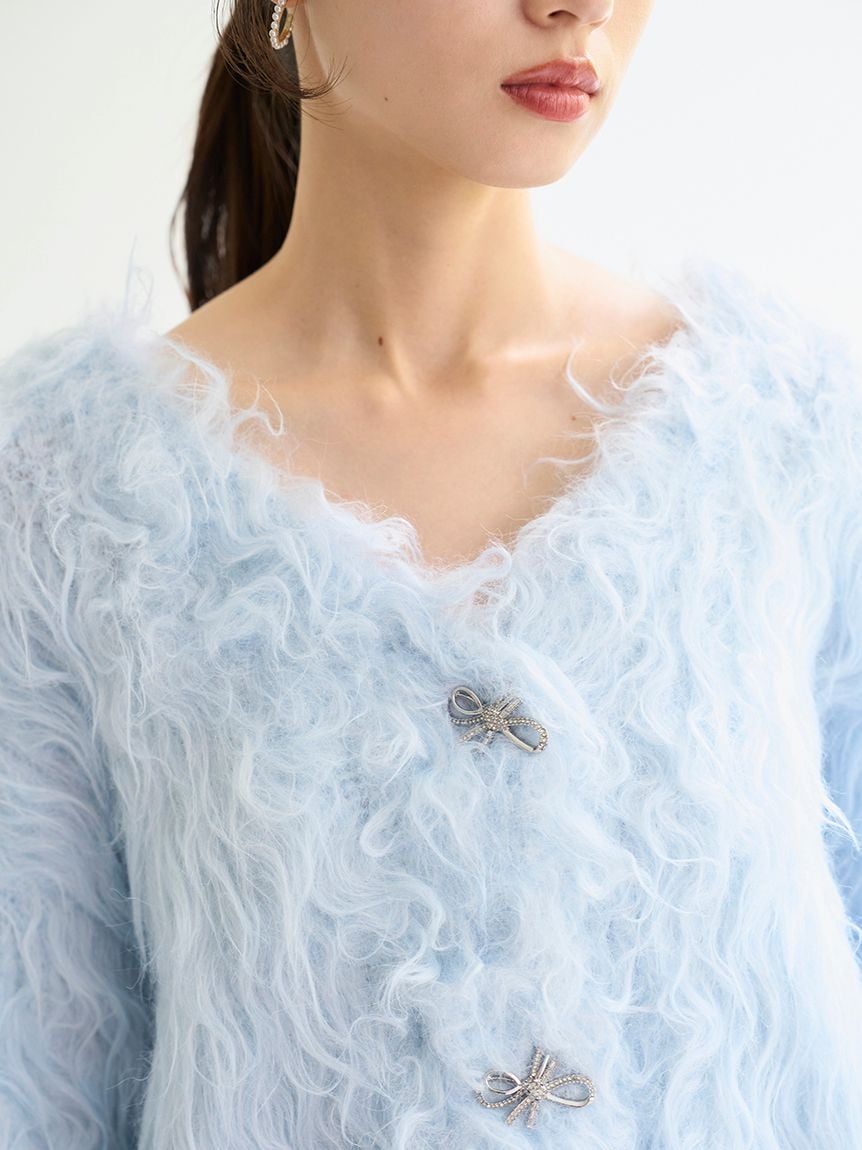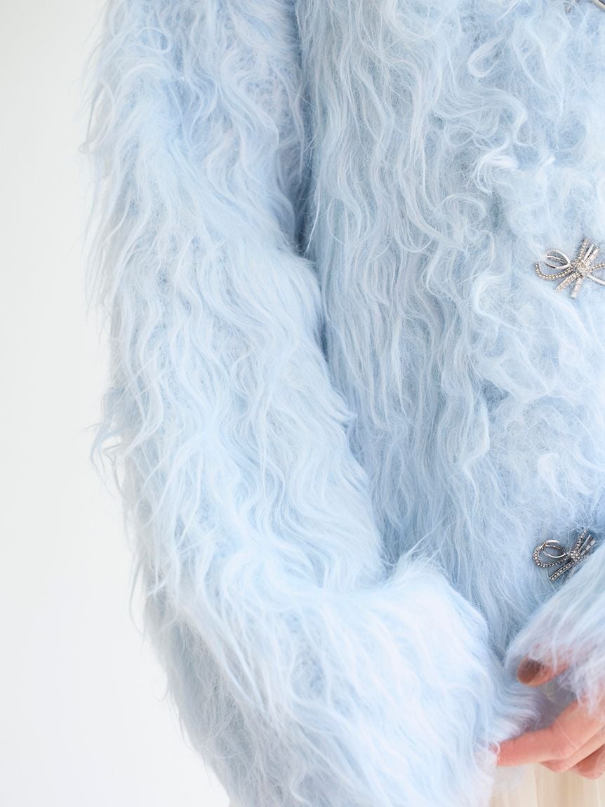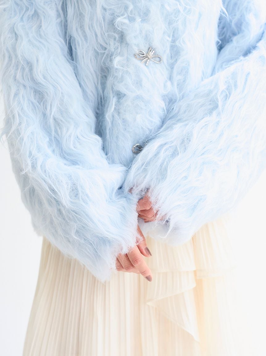 白色、帶霧感的灰色、淺藍色三色展開。使用帶光澤的長毛捲曲紗線,呈現豐盈的蓬鬆感。水鑽鈕釦為SNIDEL原創設計。
