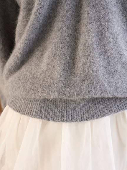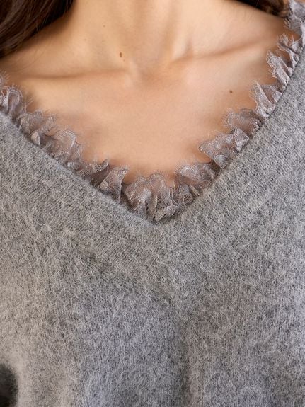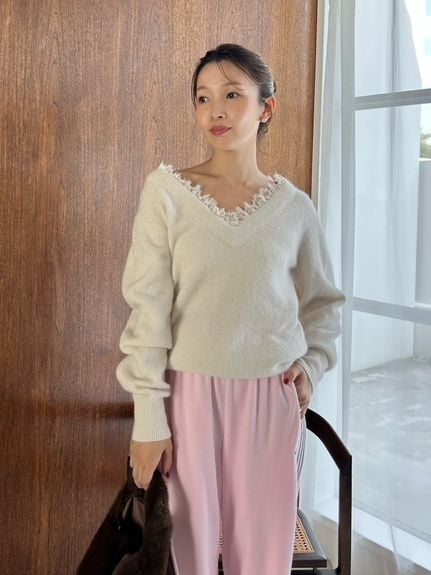 以狐狸毛與羊毛混紡紗線打造,觸感輕軟蓬鬆、帶來溫暖氛圍的V領針織上衣。寬版V領能自然修飾鎖骨線條,領口周圍加入細緻的聚摺蕾絲,同色調的柔和光影讓整體更添優雅女性韻味。