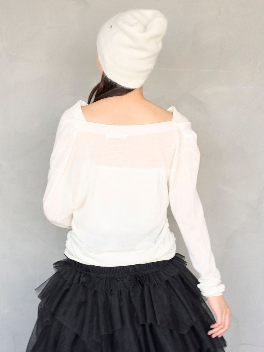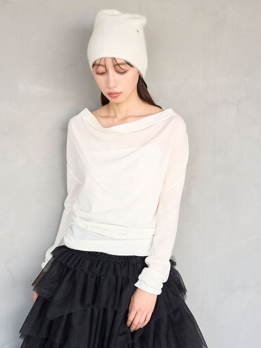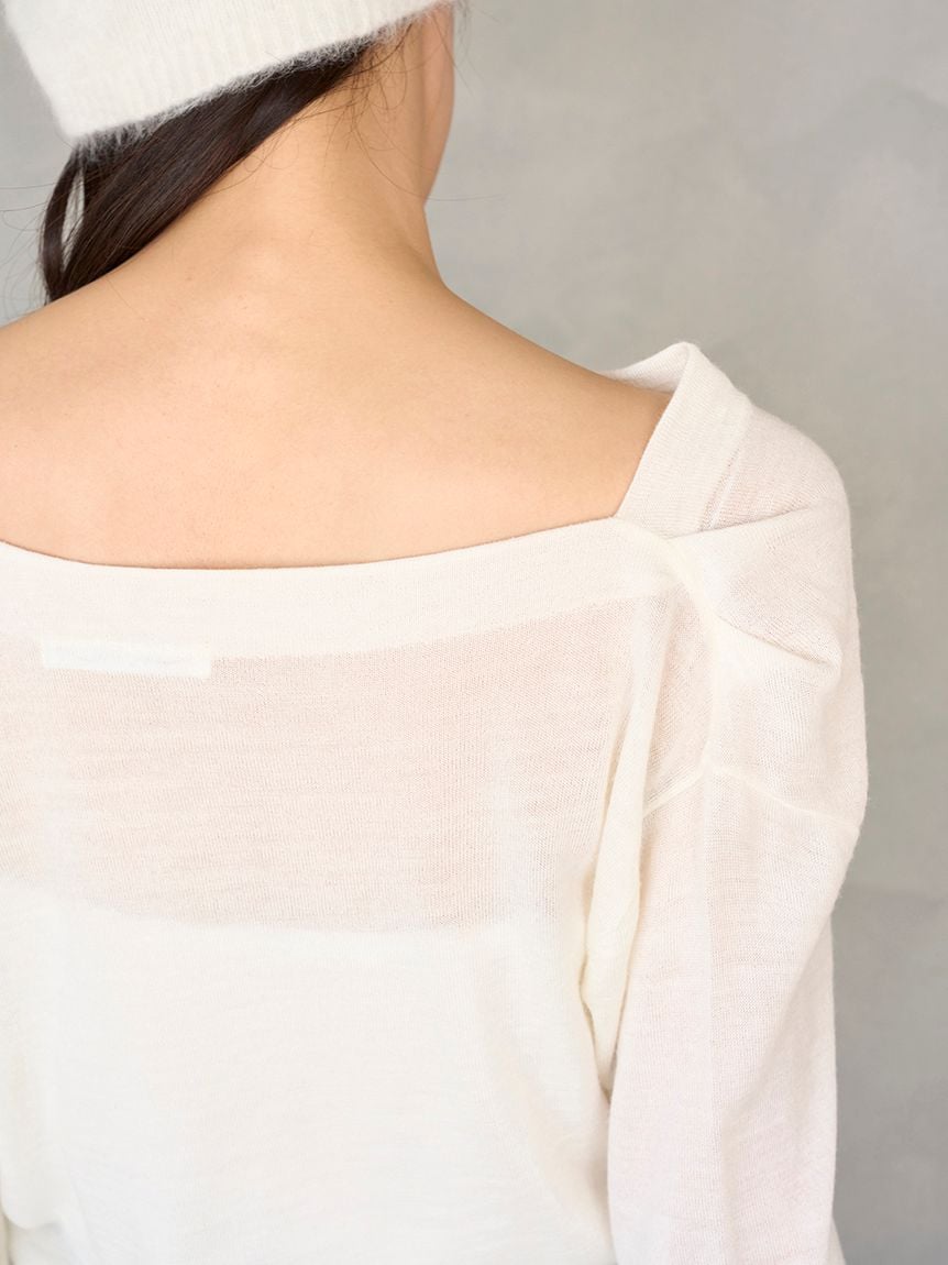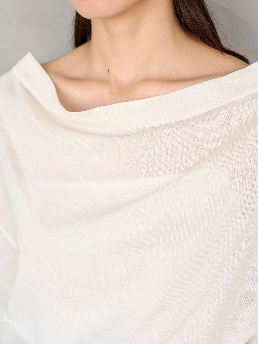 以羊毛混紡、帶有細緻光澤感的針織紗線,採用16針距天竺編織製成的不對稱領口針織上衣。細密的針距讓整體質感更顯俐落高雅。