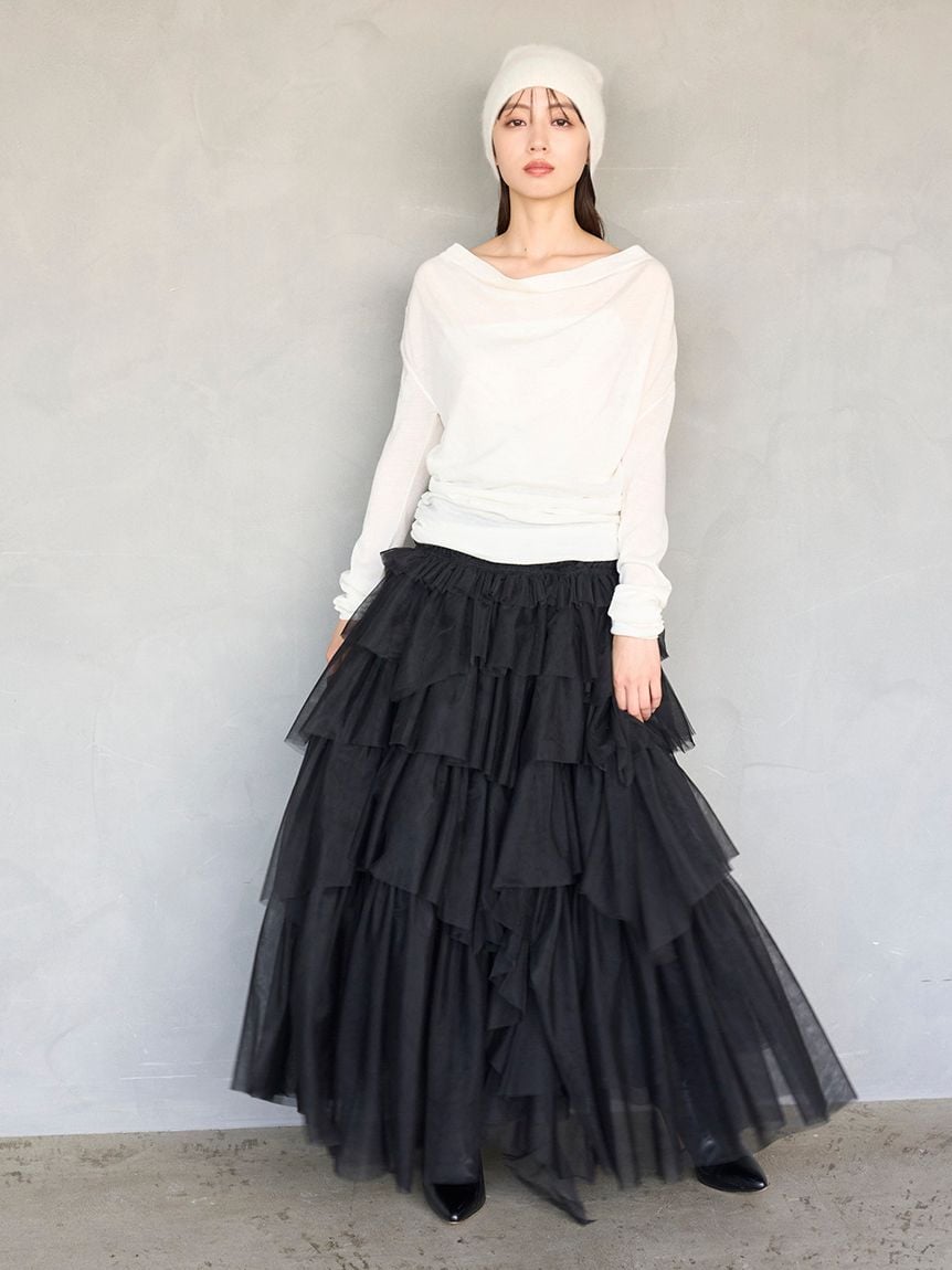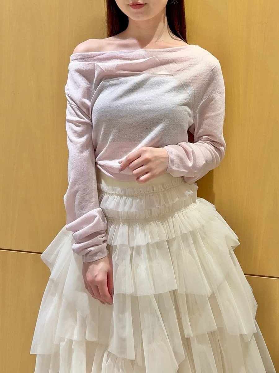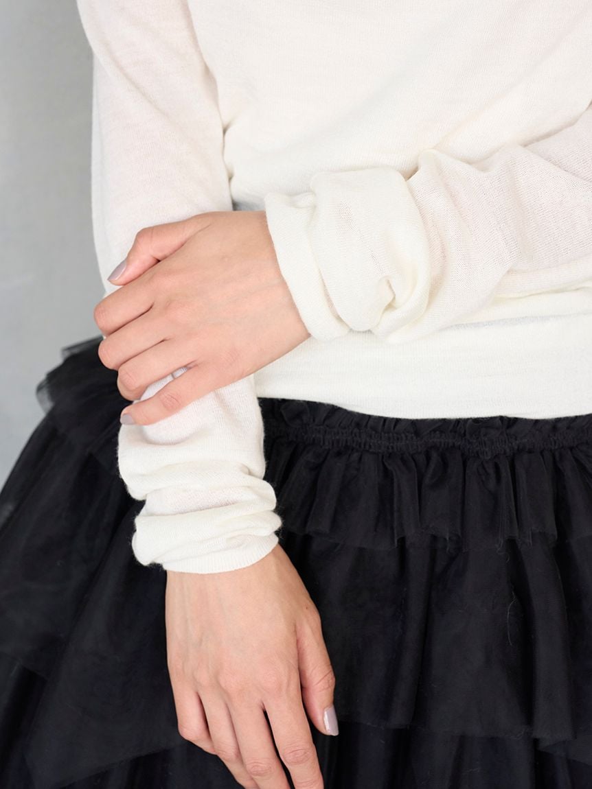 以羊毛混紡、帶有細緻光澤感的針織紗線,採用16針距天竺編織製成的不對稱領口針織上衣。細密的針距讓整體質感更顯俐落高雅。