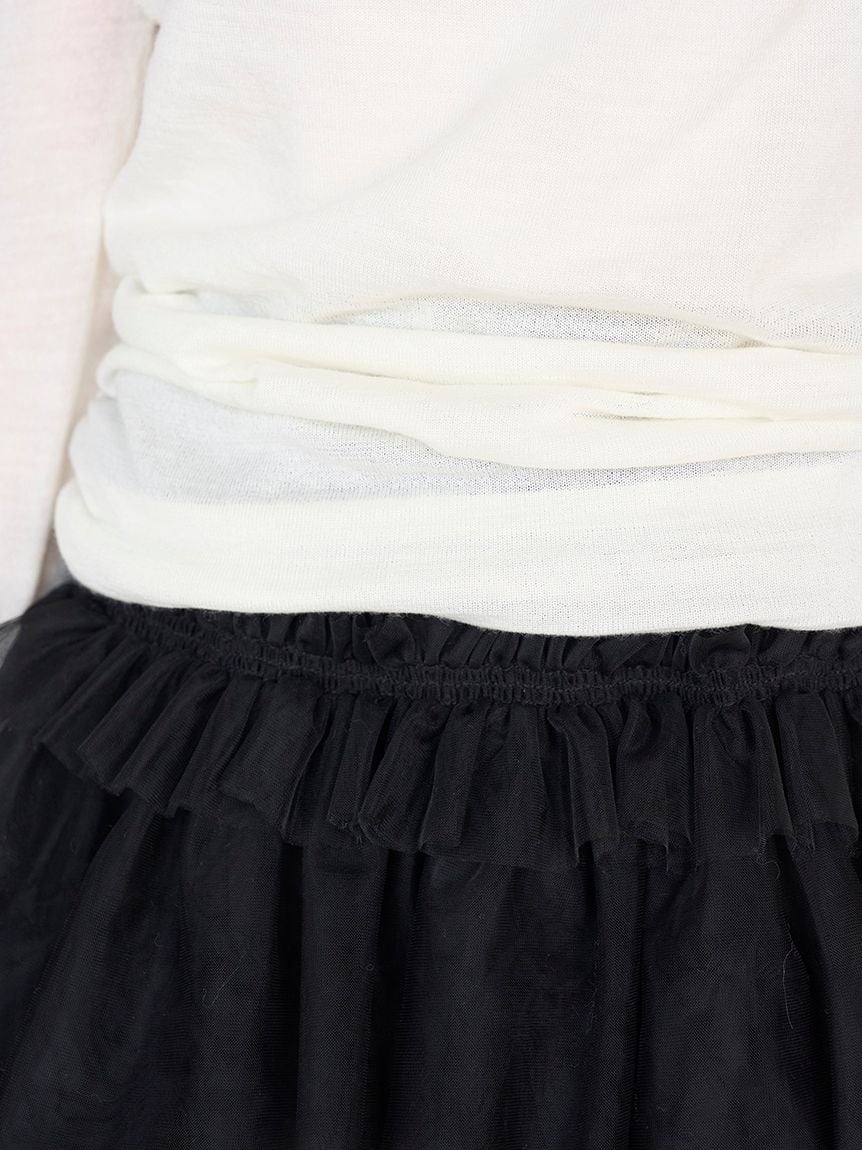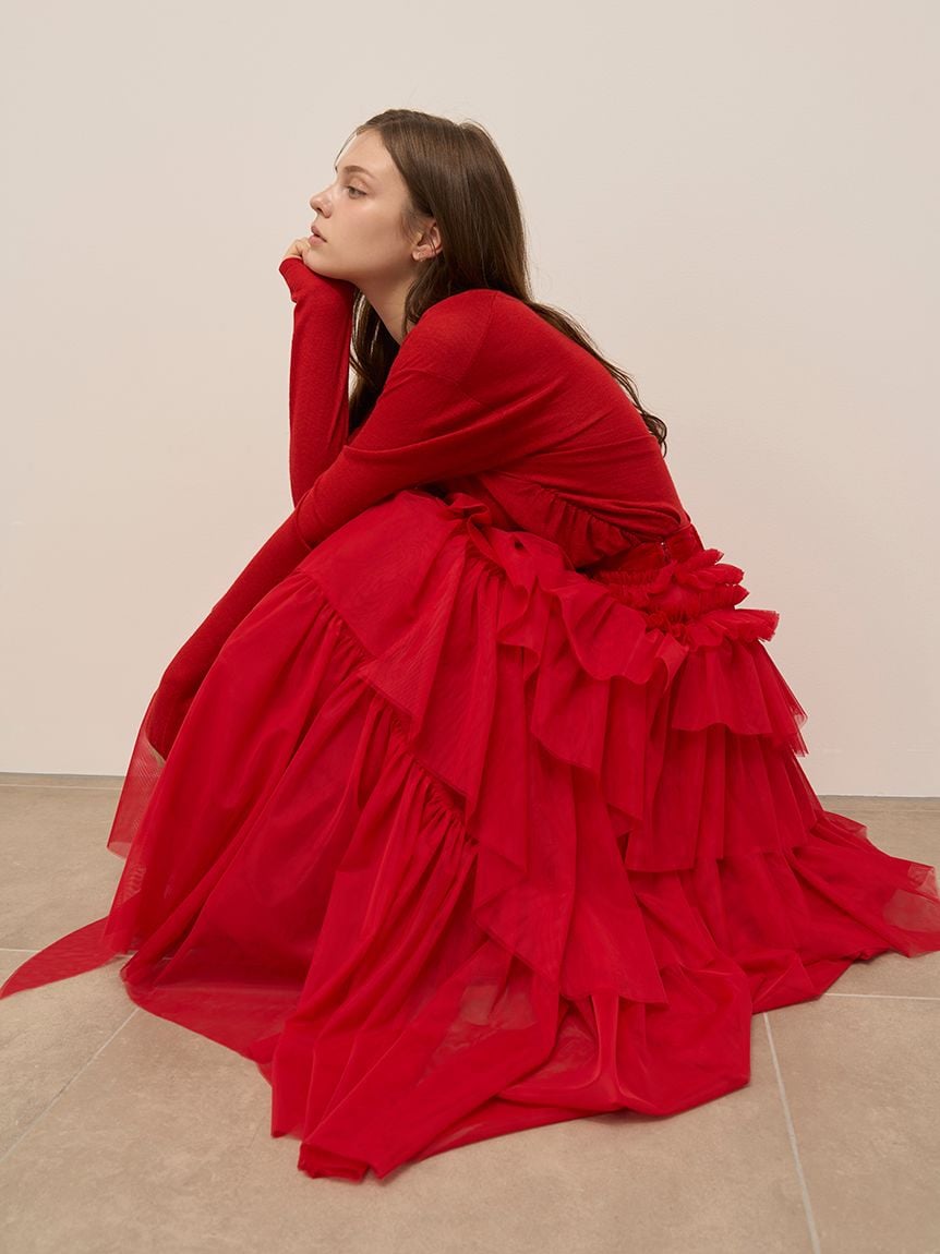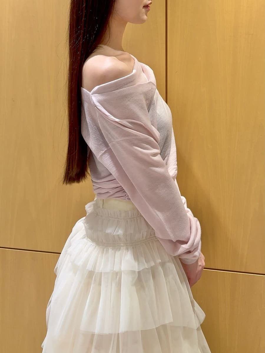 選用略帶透膚感的輕薄針織布料,使領口的垂墜線條與腰側的抓皺細節自然呈現,勾勒柔和輪廓。