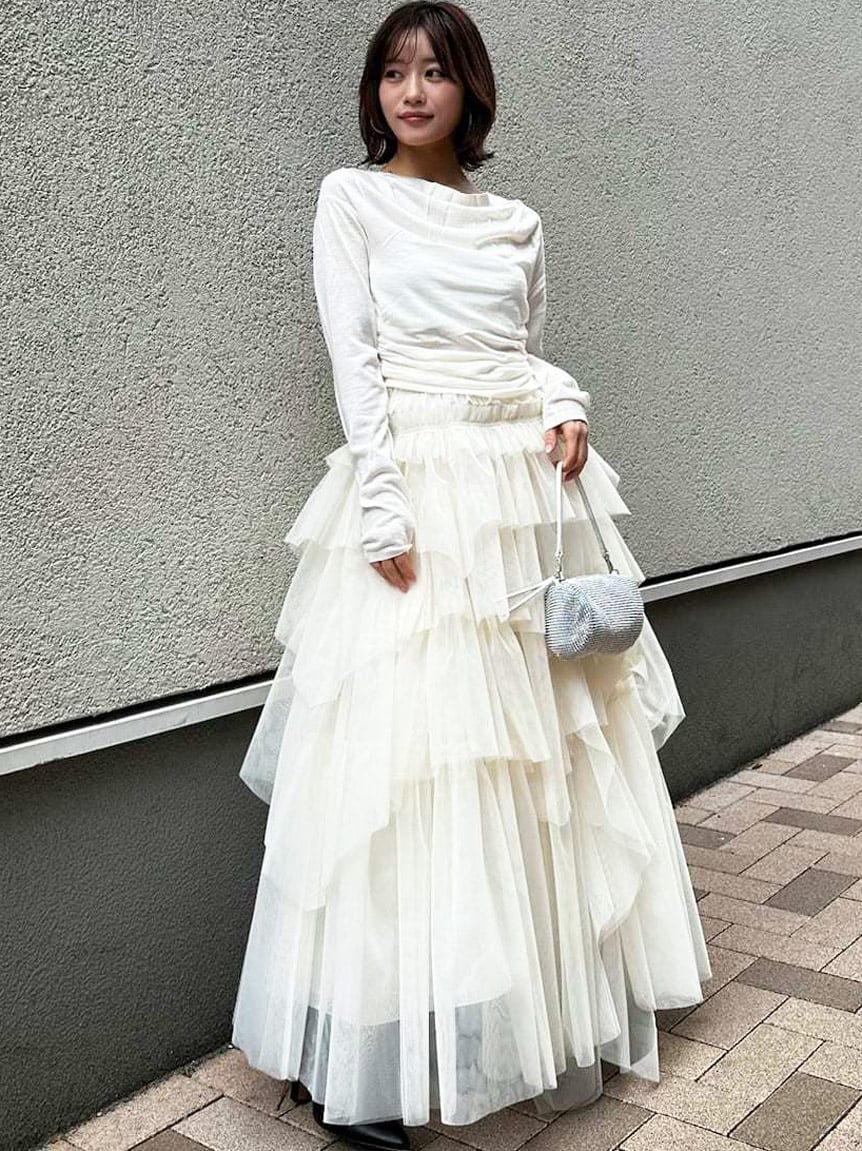 領口為富有時髦感的垂墜設計,亦可將右肩自然滑落,變化為斜肩穿著方式,展現不同造型表情。