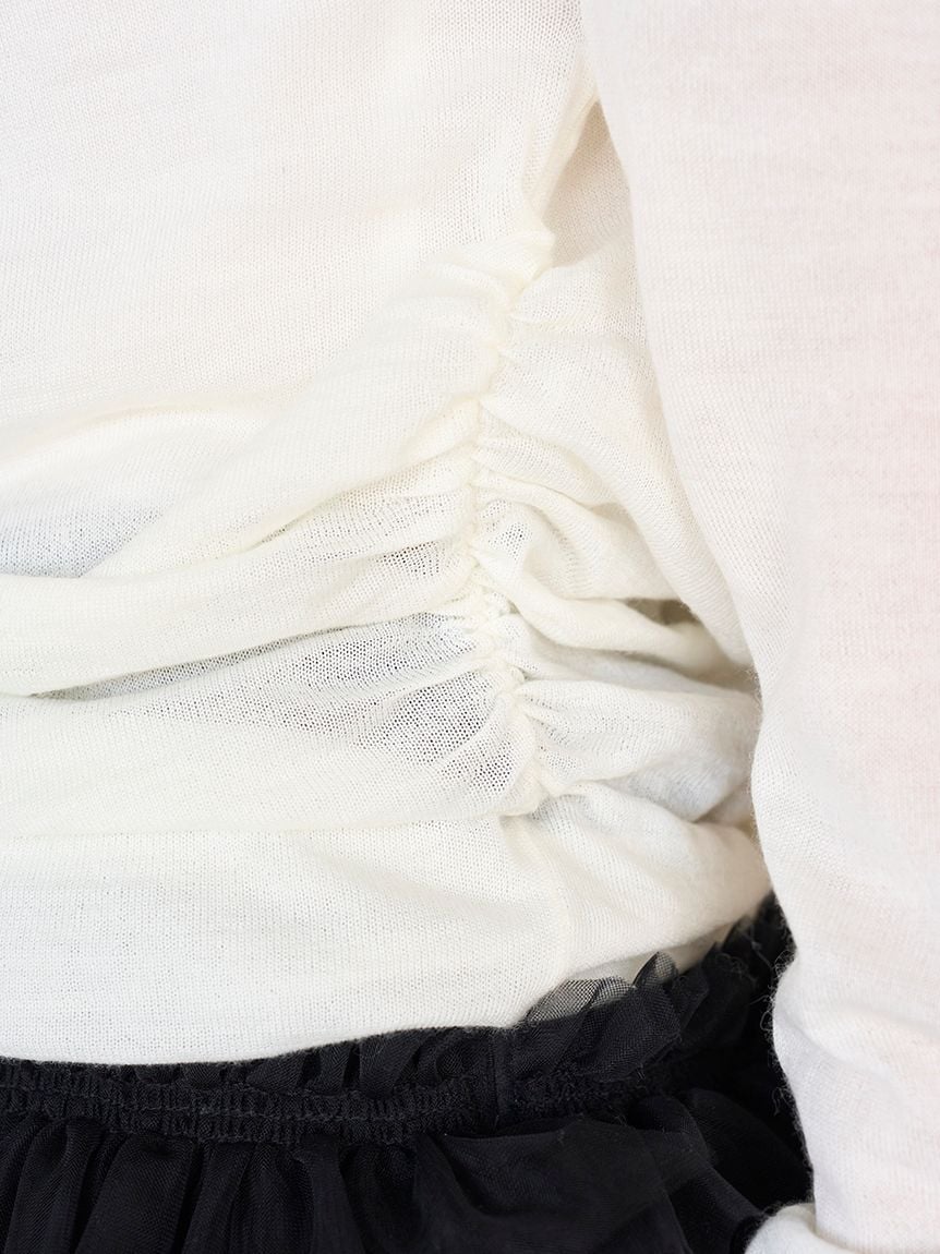 袖長設定略長,增添輕盈垂墜感;側邊加入鬆緊設計,形成自然皺褶,穿著時更具層次變化。