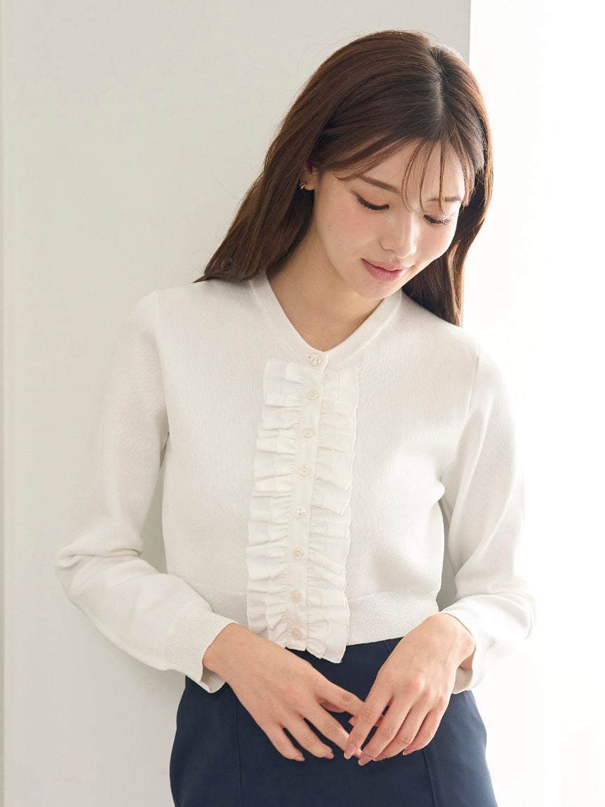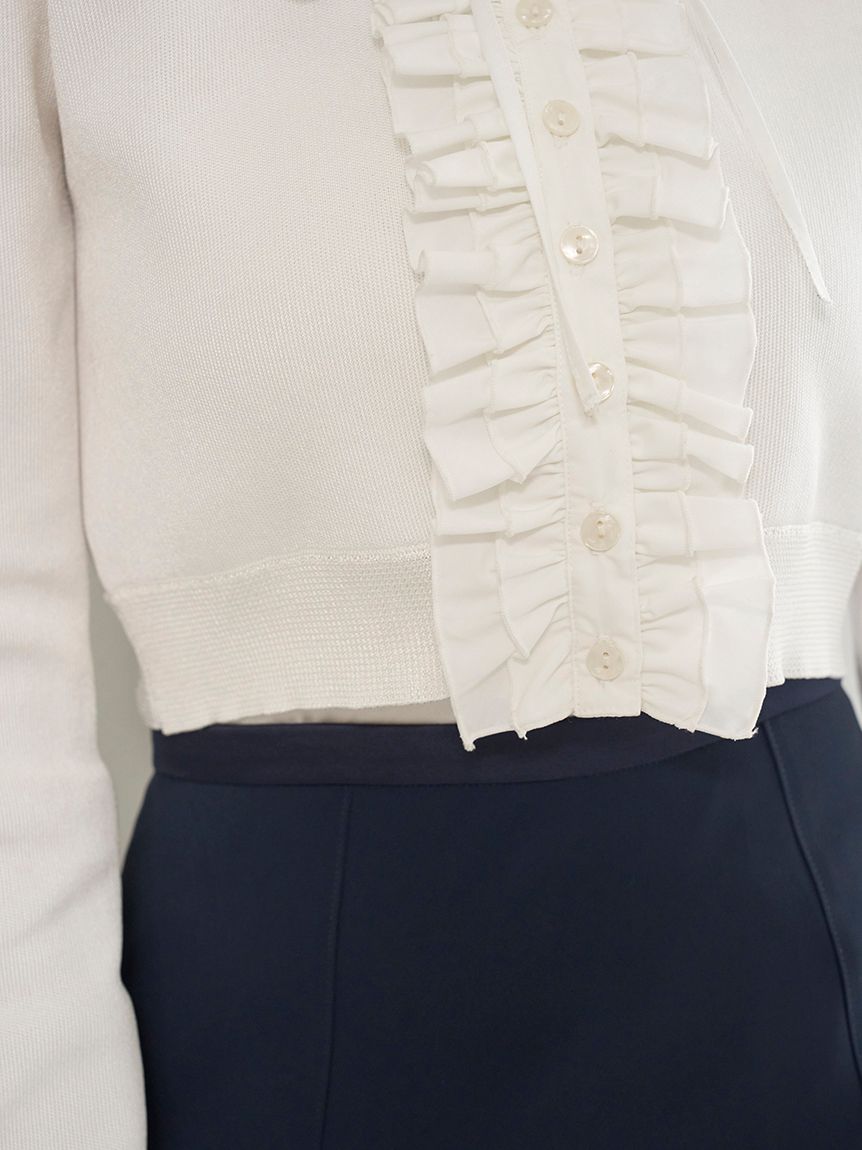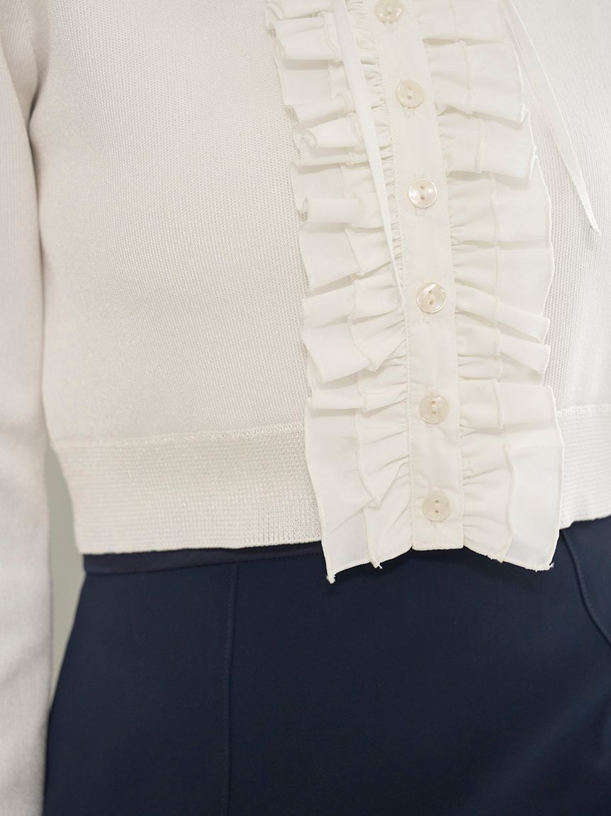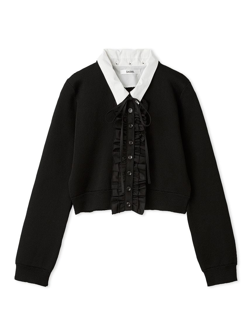 領子與前襟部分拼接襯衫布料,呈現經典又摩登的主角級荷葉邊針織開襟衫。