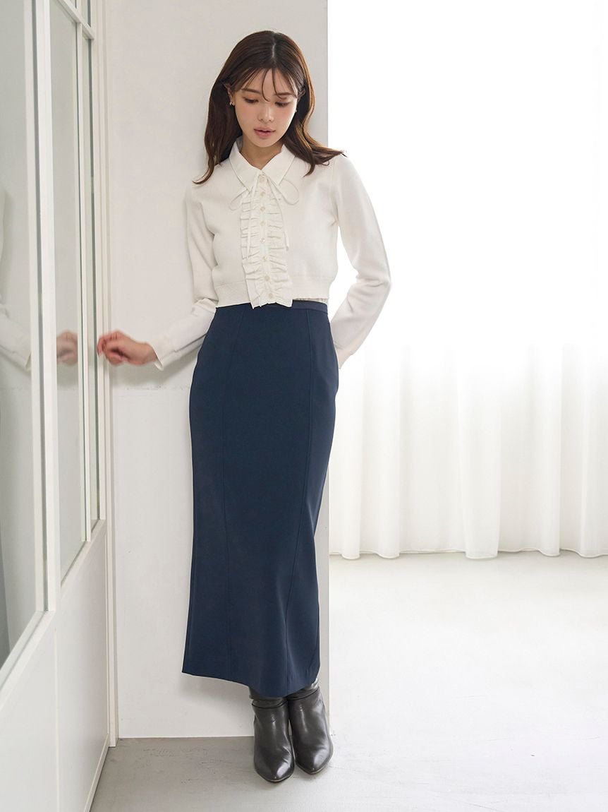 前襟裝飾有襯衫布料的復古層次荷葉邊,再加上細緞帶,增添華麗感與立體感。