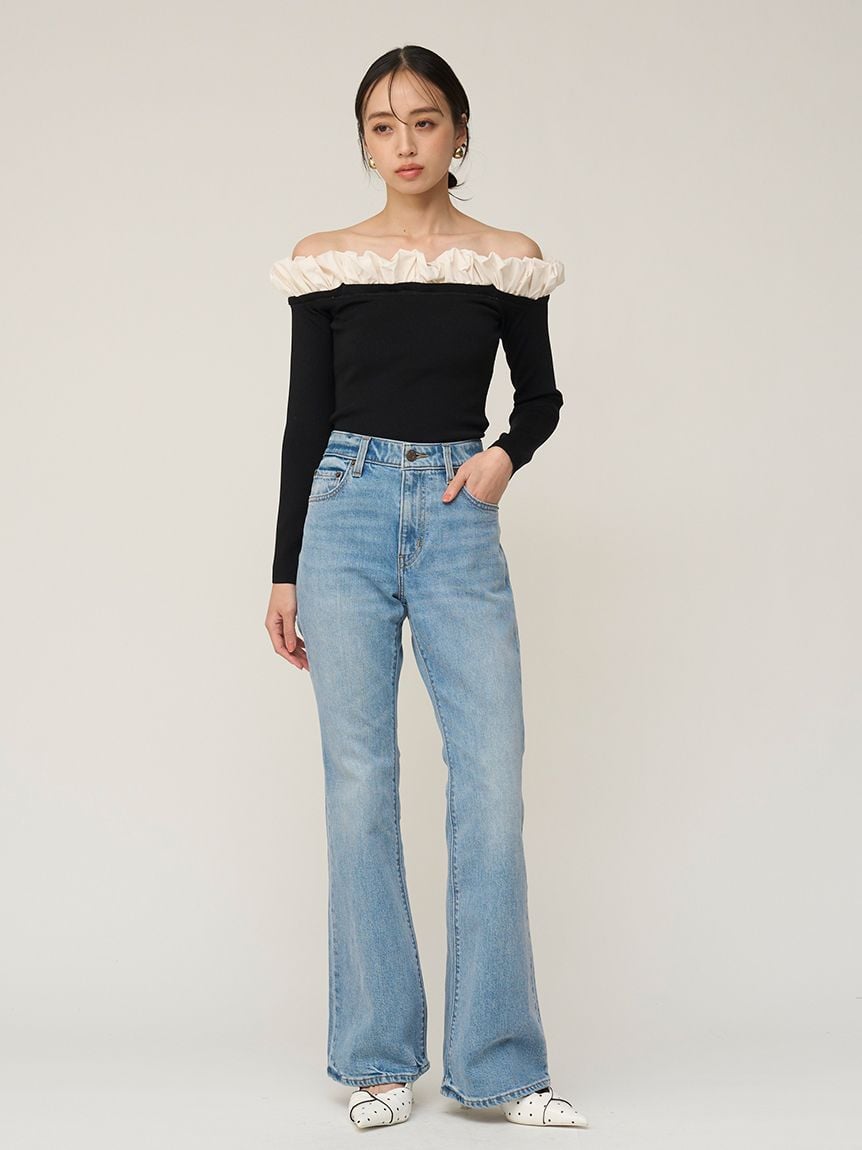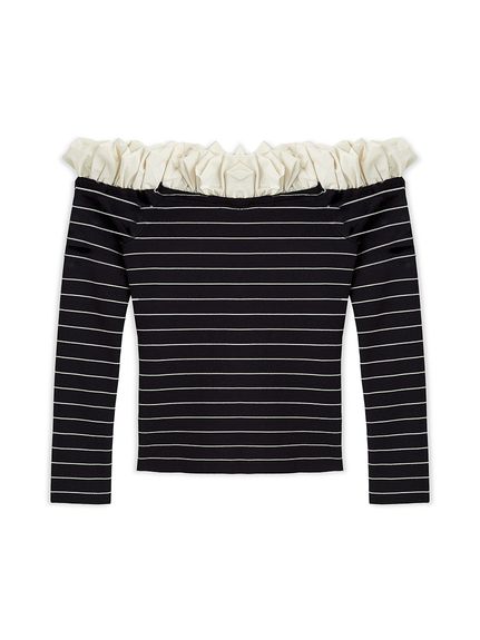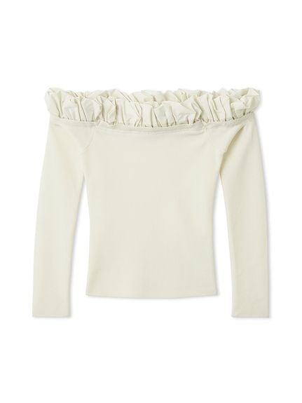 【領口增添時尚泡泡荷葉邊的露肩針織上衣】