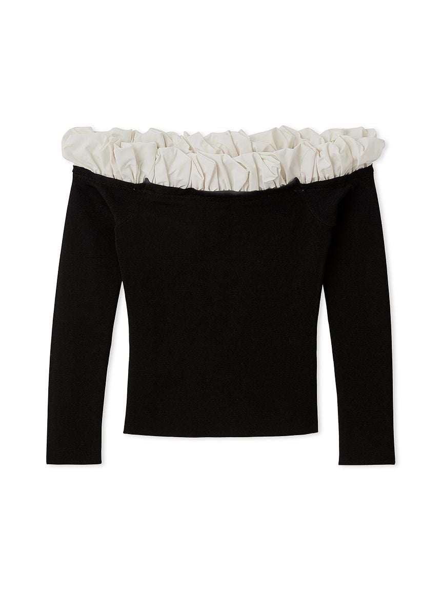 這款露肩針織上衣在領口設計了蓬鬆泡泡荷葉邊,增添華麗感。