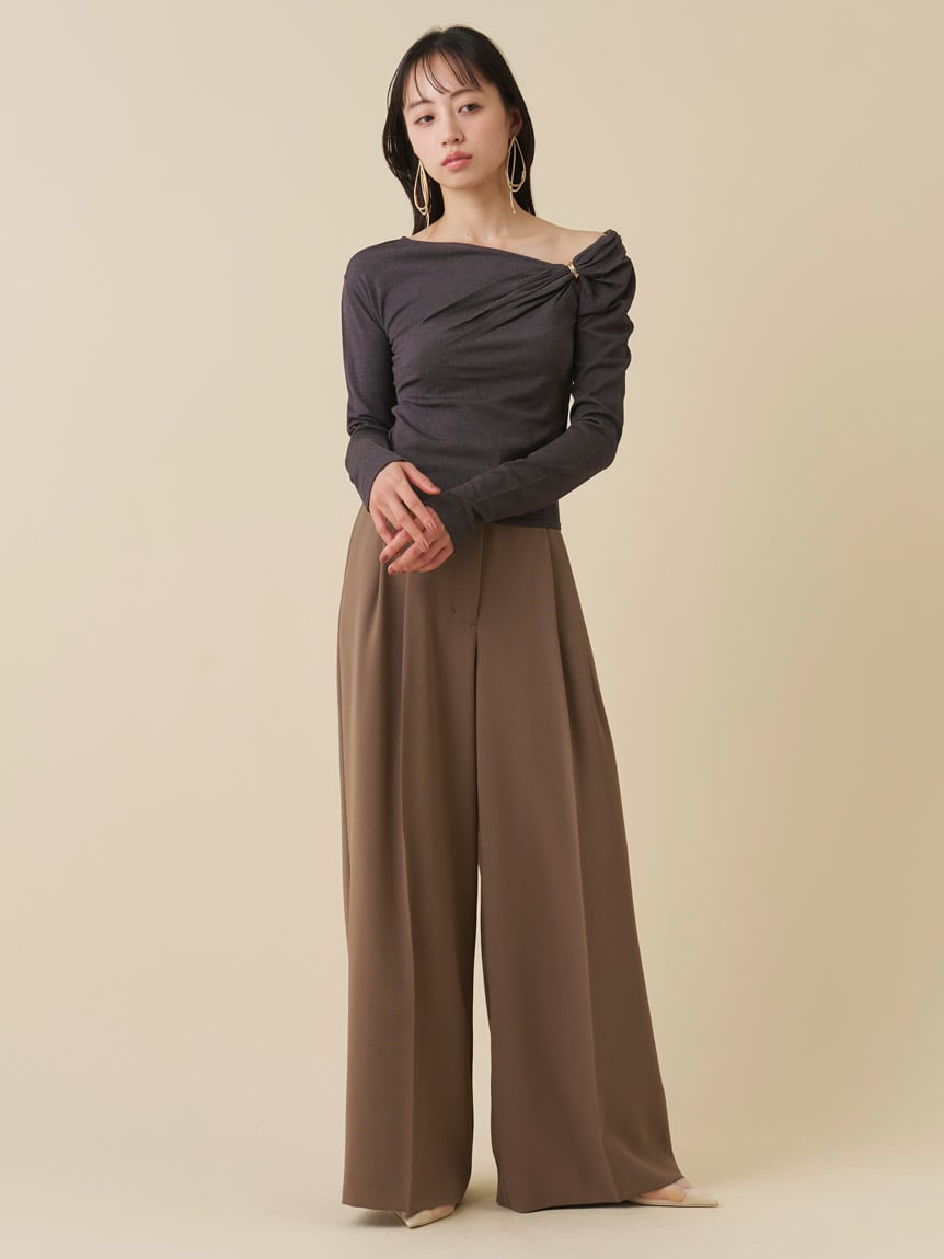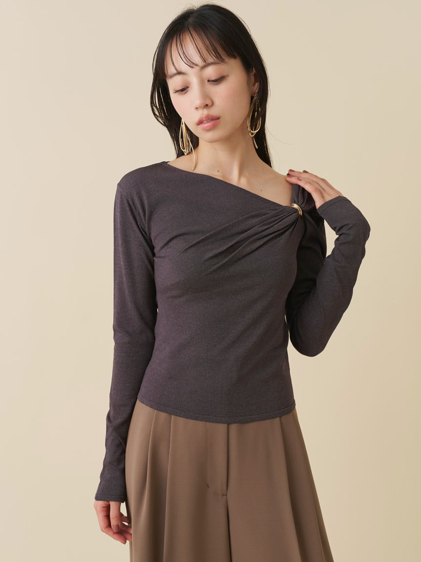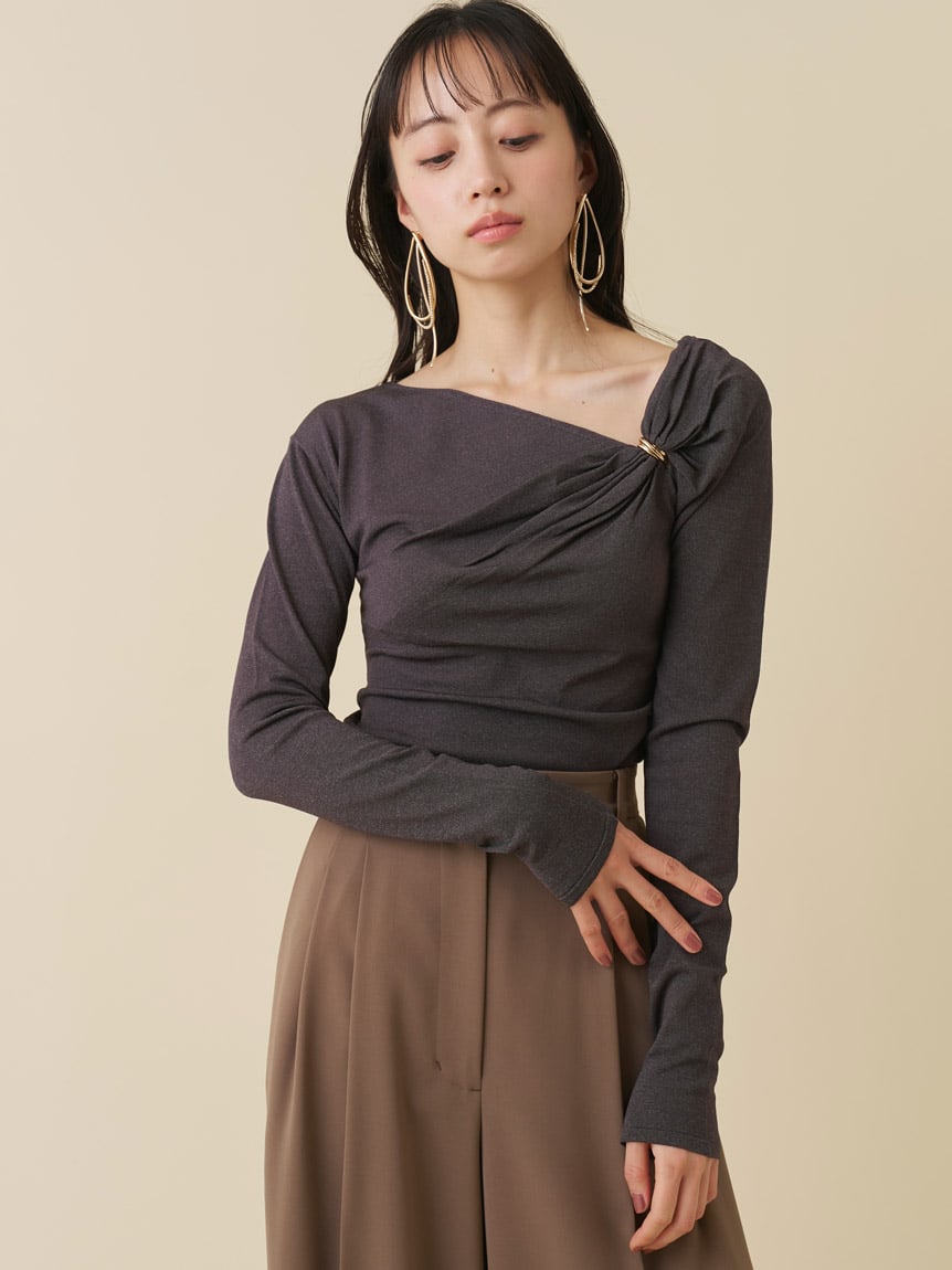 這款針織上衣在左胸前裝飾了光澤感的金屬配件,成為視覺焦點,營造垂褶效果。