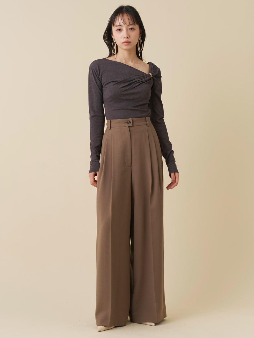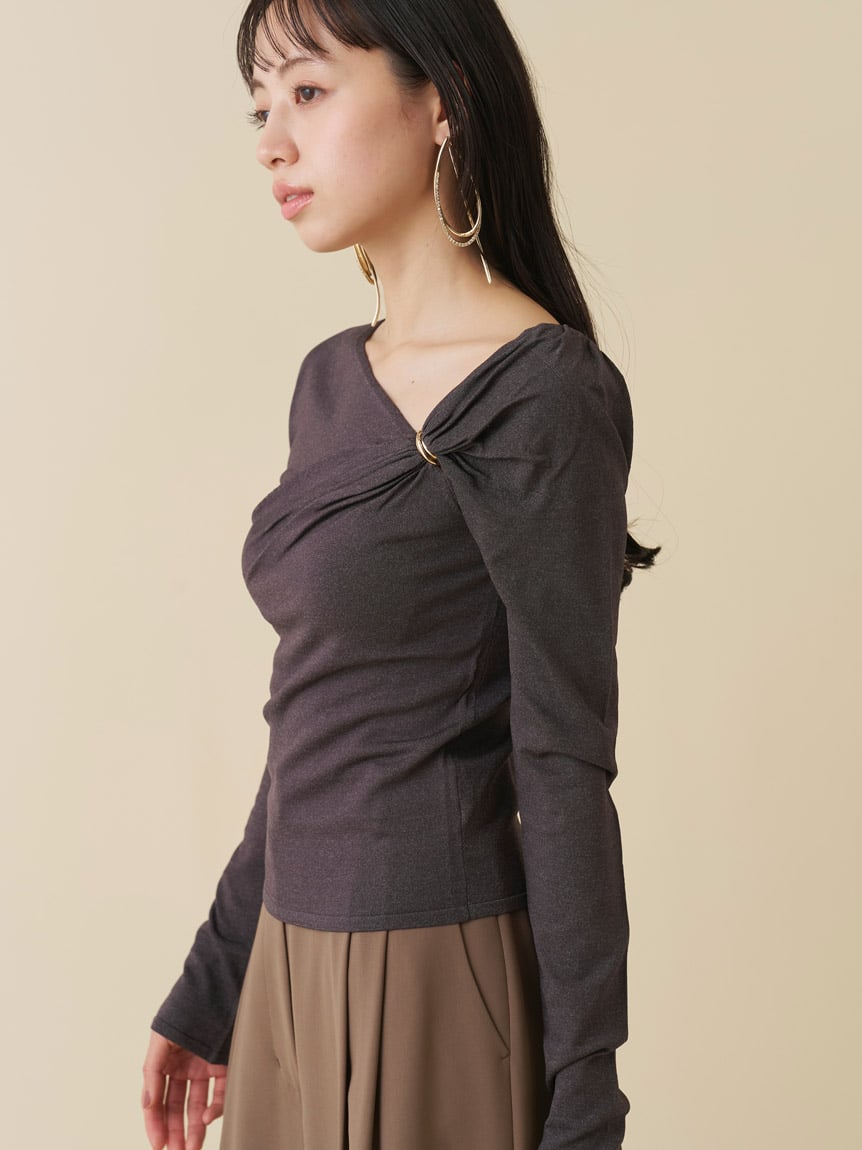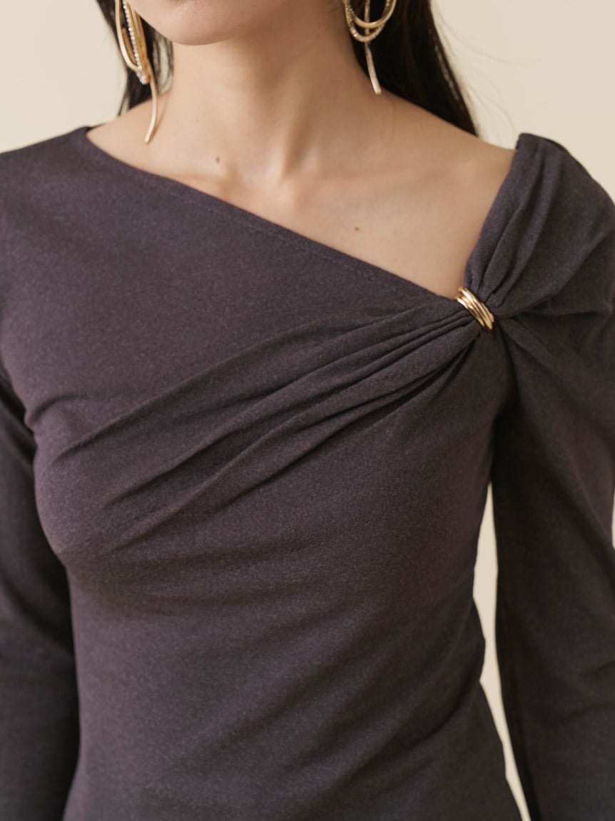 【胸前金屬配件設計,帶出垂褶感的時尚針織上衣】