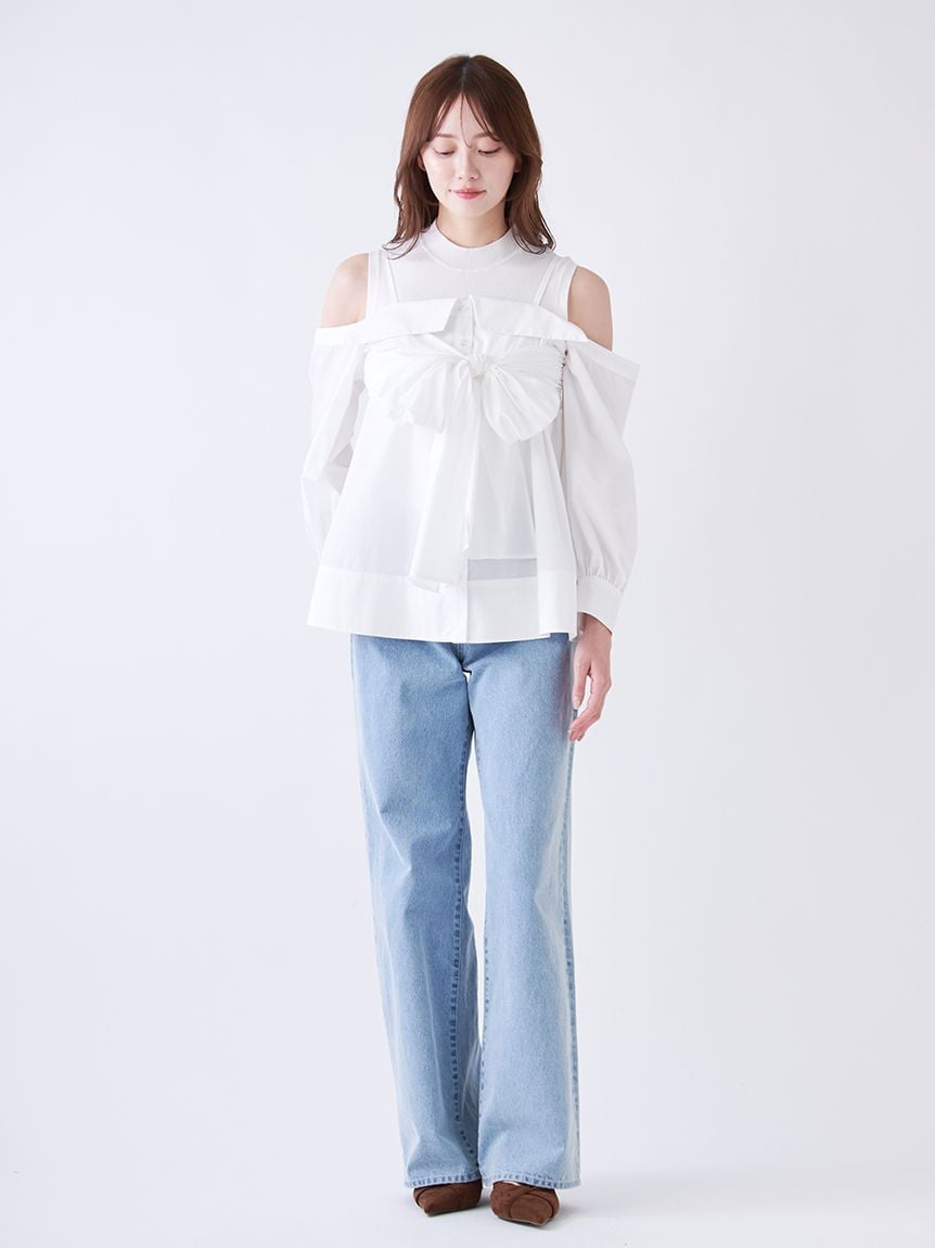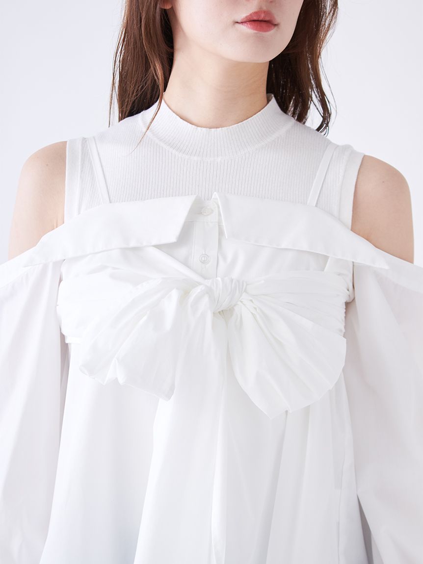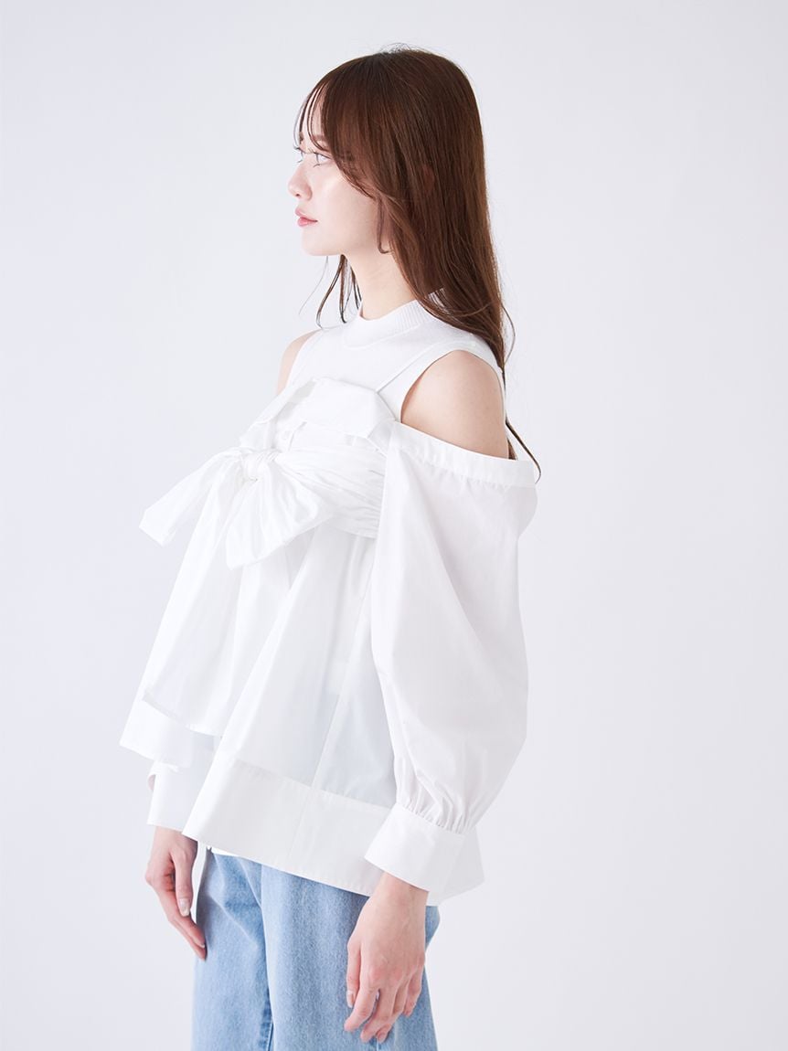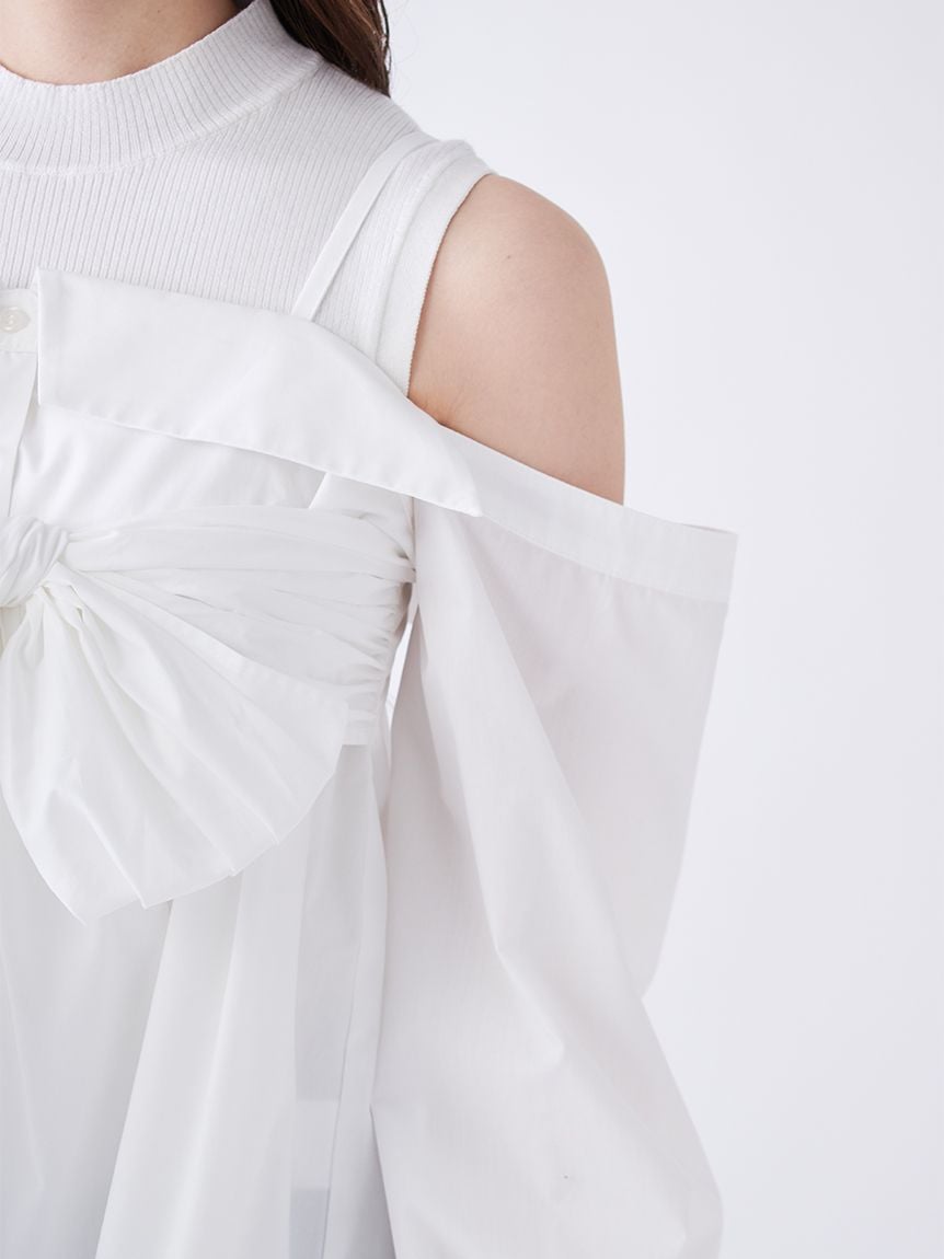 【華麗感的露肩設計襯衫與無袖針織上衣套組】