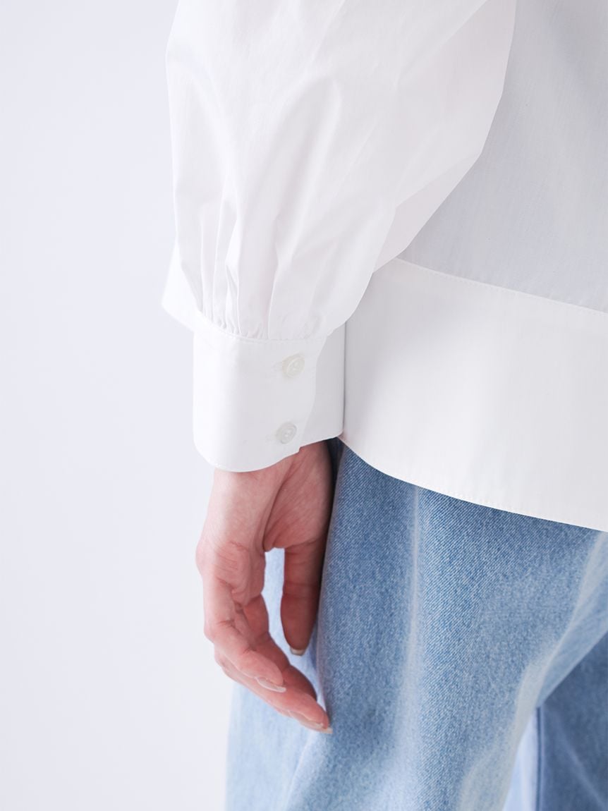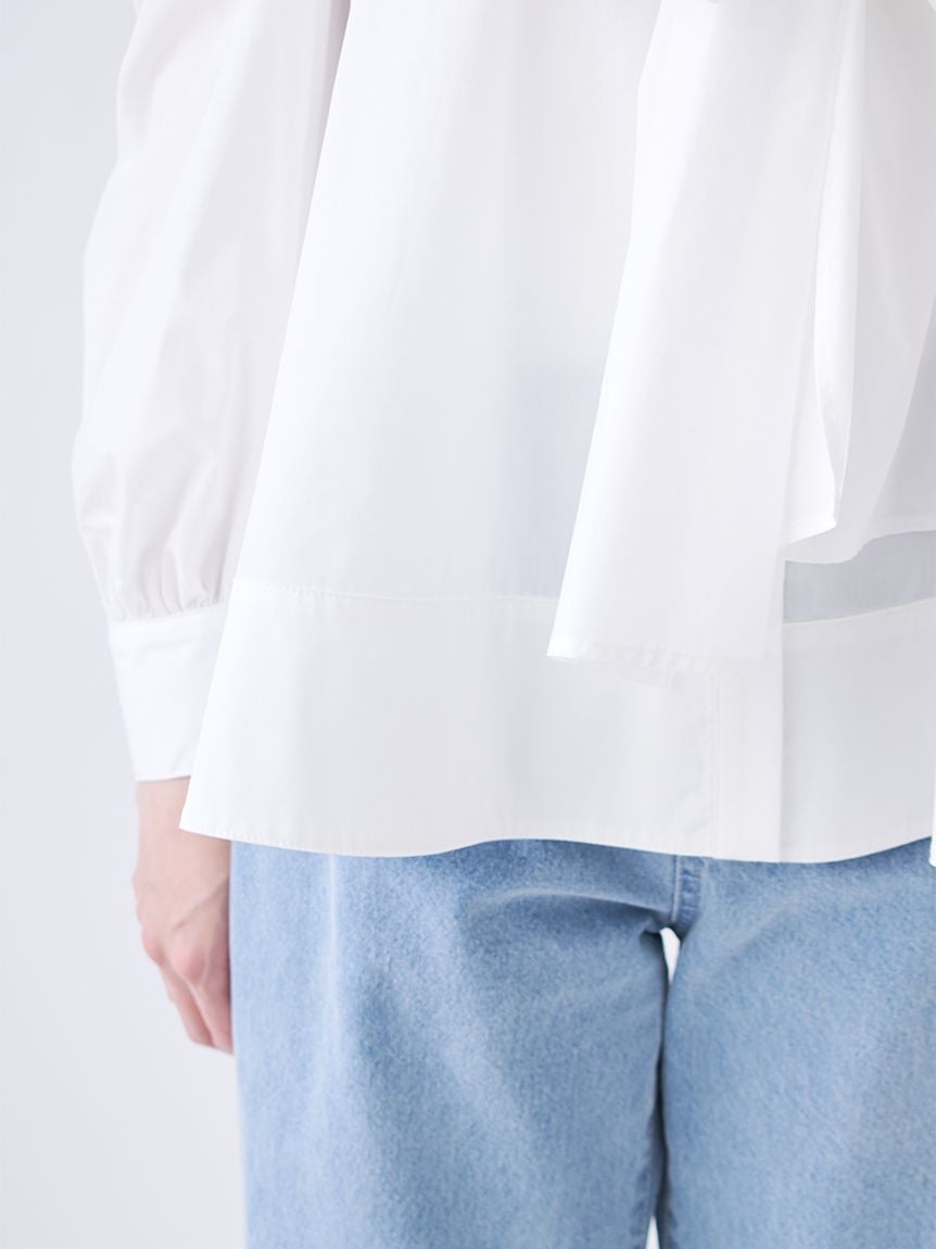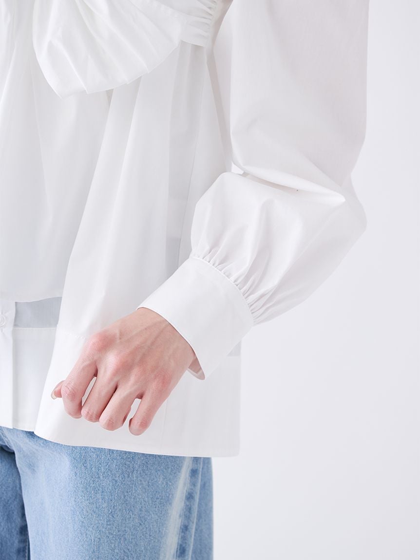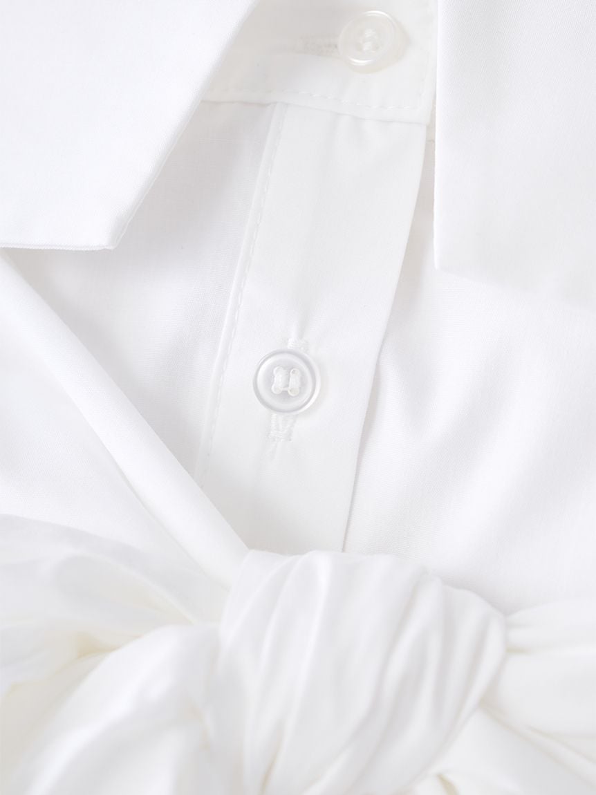 襯衫側邊收納大量布料,胸前下方可打出蝴蝶結或緊結,呈現隨性又有設計感的效果。