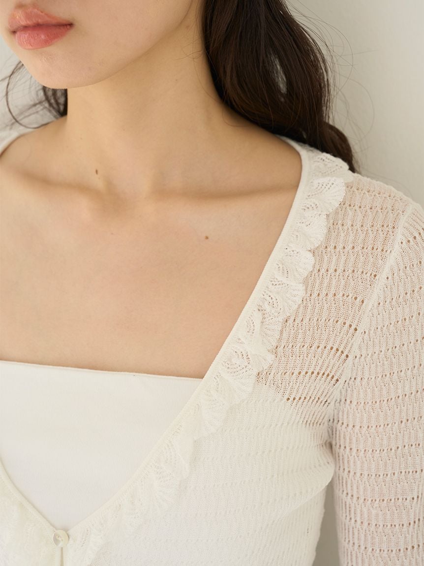 領口細緻的蕾絲荷葉邊細節,增添女性柔美感。