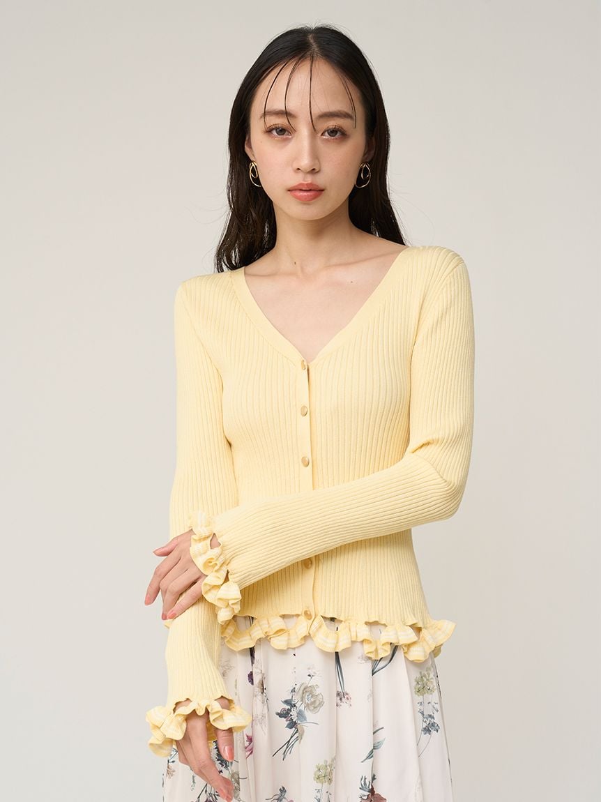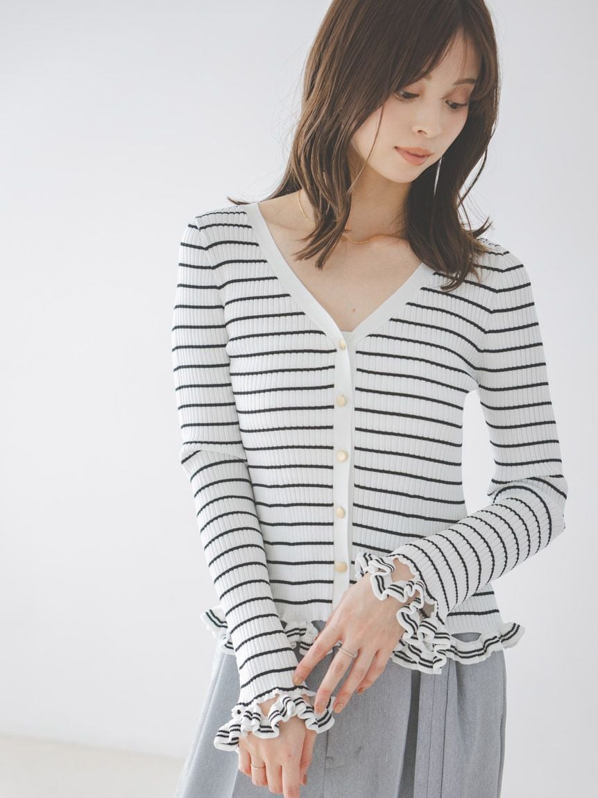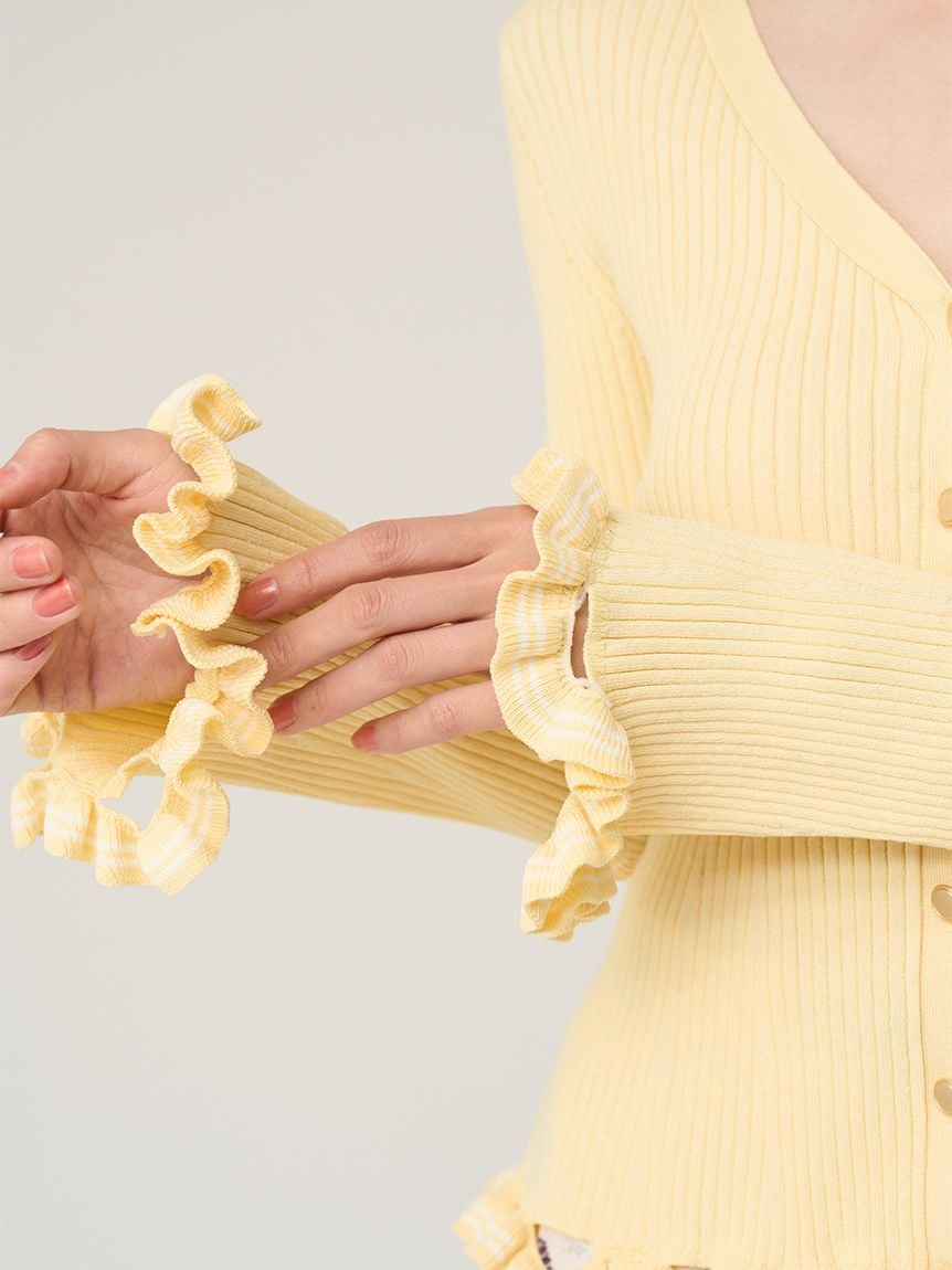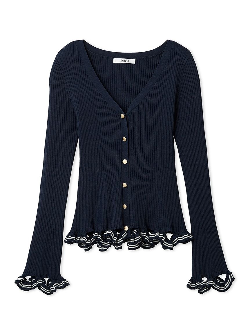 V領羅紋針織外套,袖口與下擺輕巧點綴同素材迷你荷葉邊。