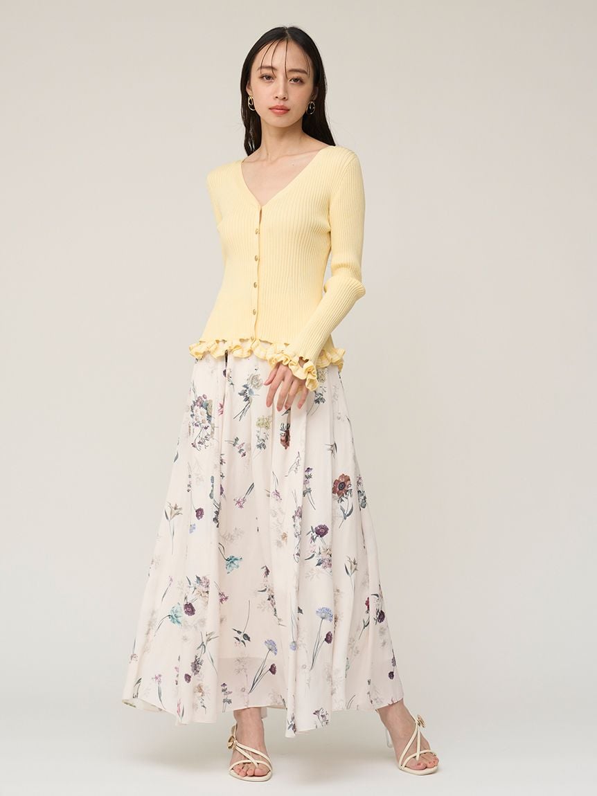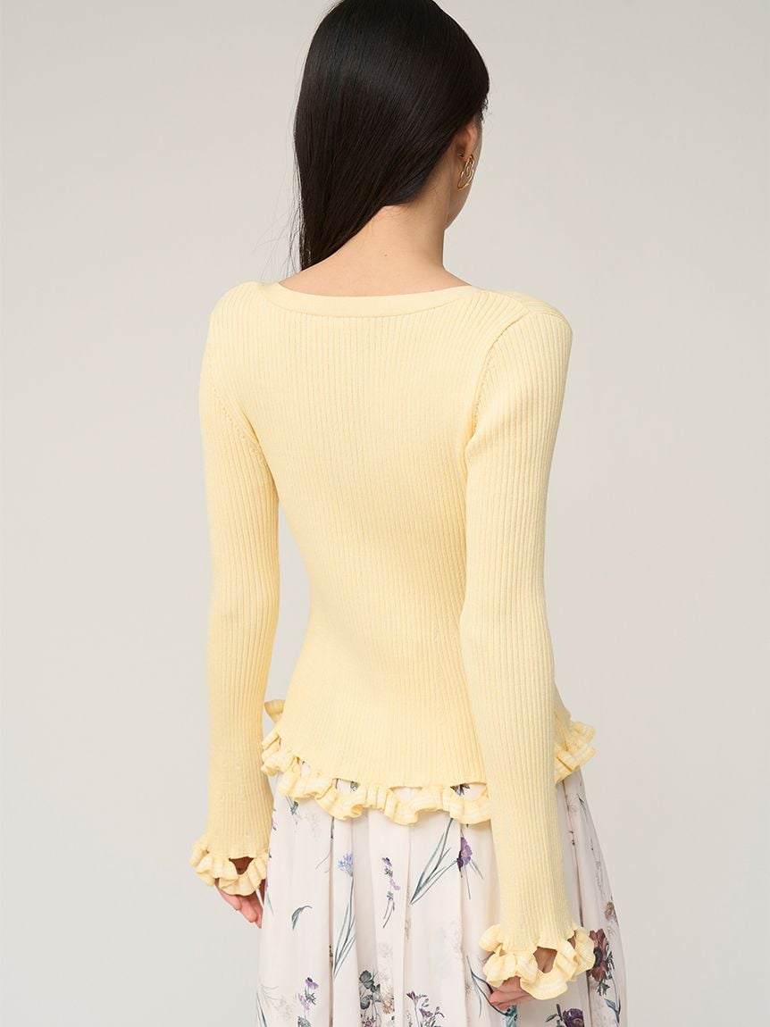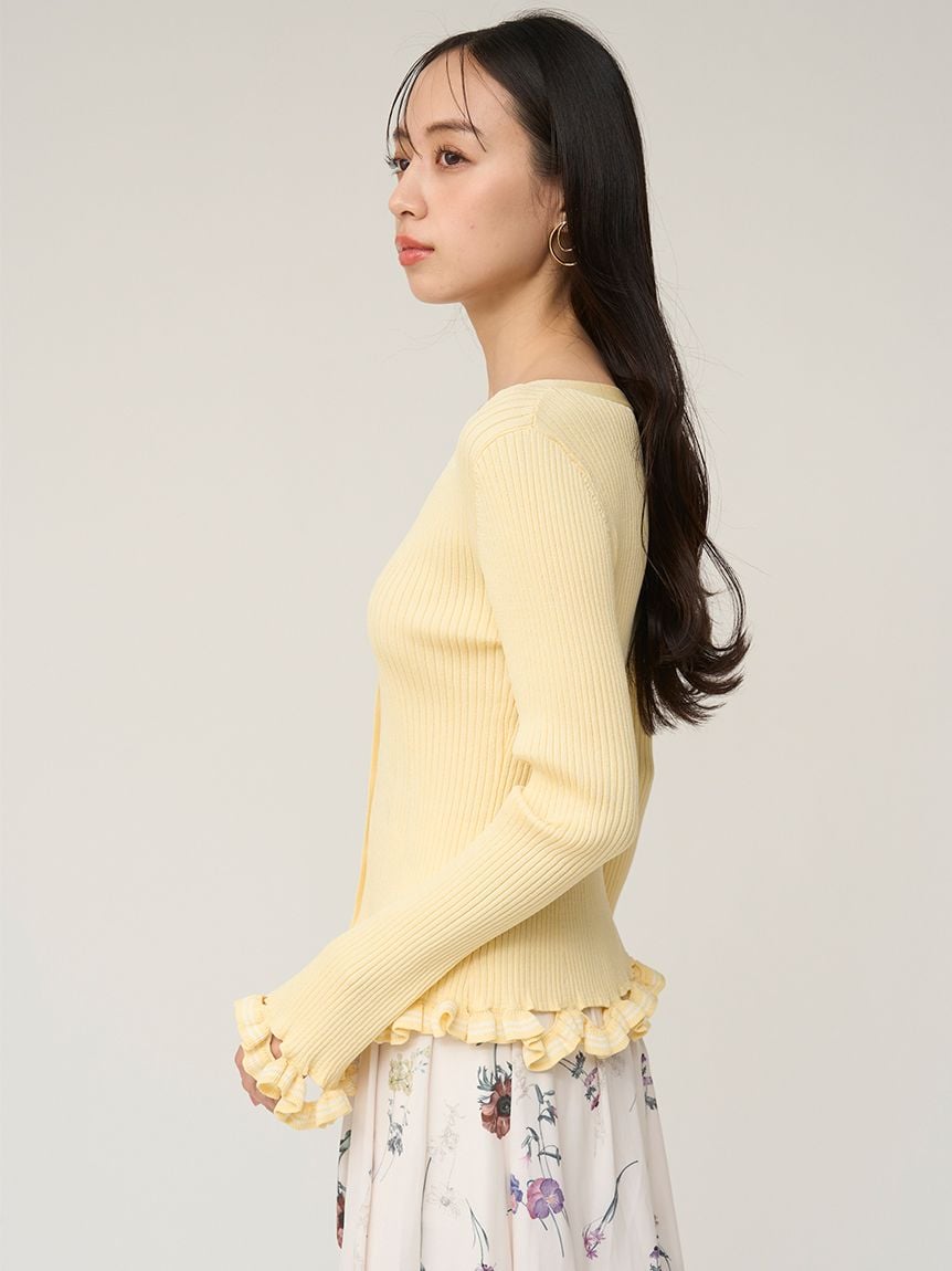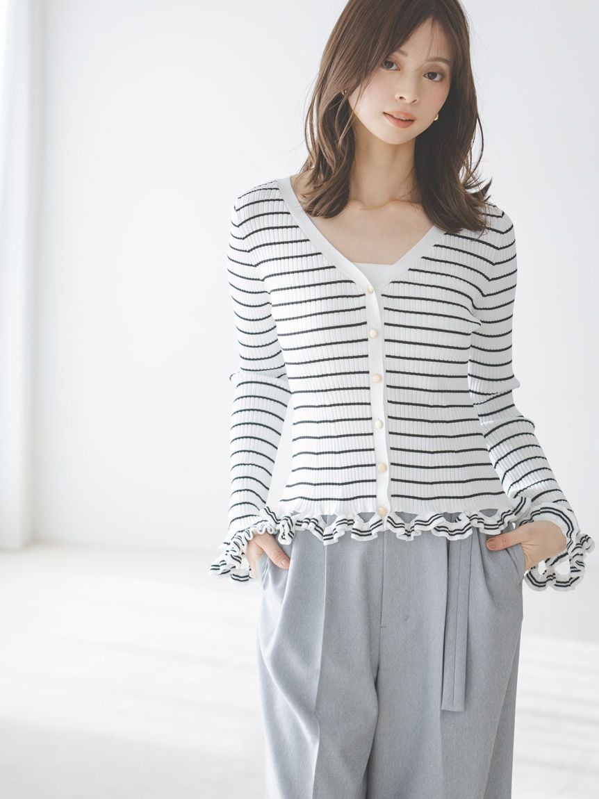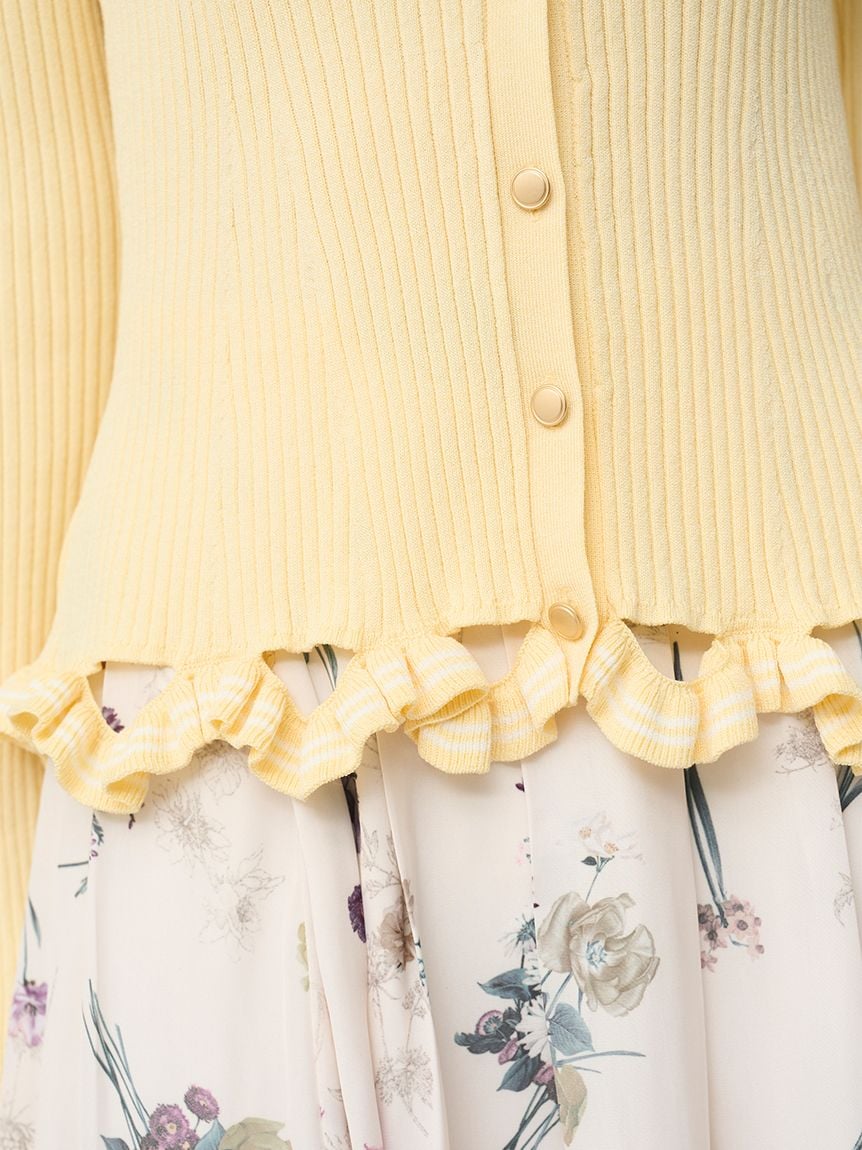 V領羅紋針織外套,袖口與下擺輕巧點綴同素材迷你荷葉邊。
