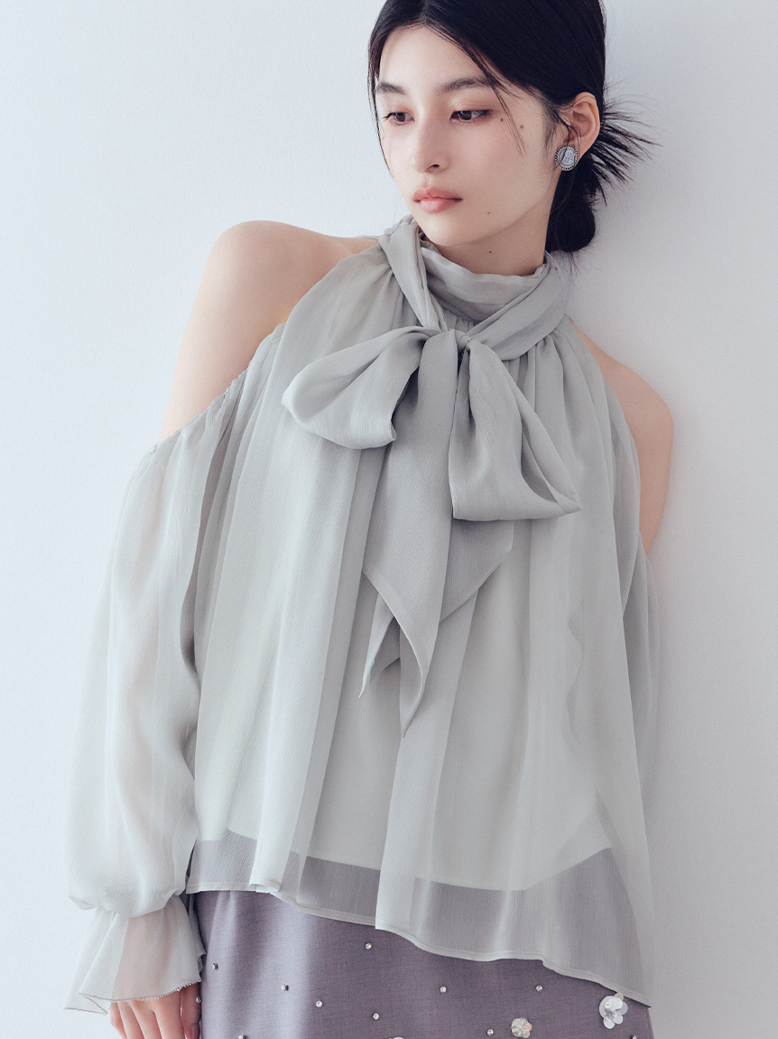 垂墜蝴蝶結雪紡露肩上衣 LWFB254224