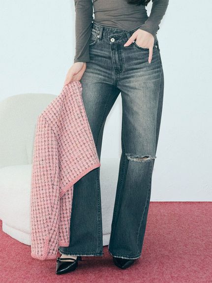 高低腰剪裁丹寧牛仔寬褲 LWFP254085